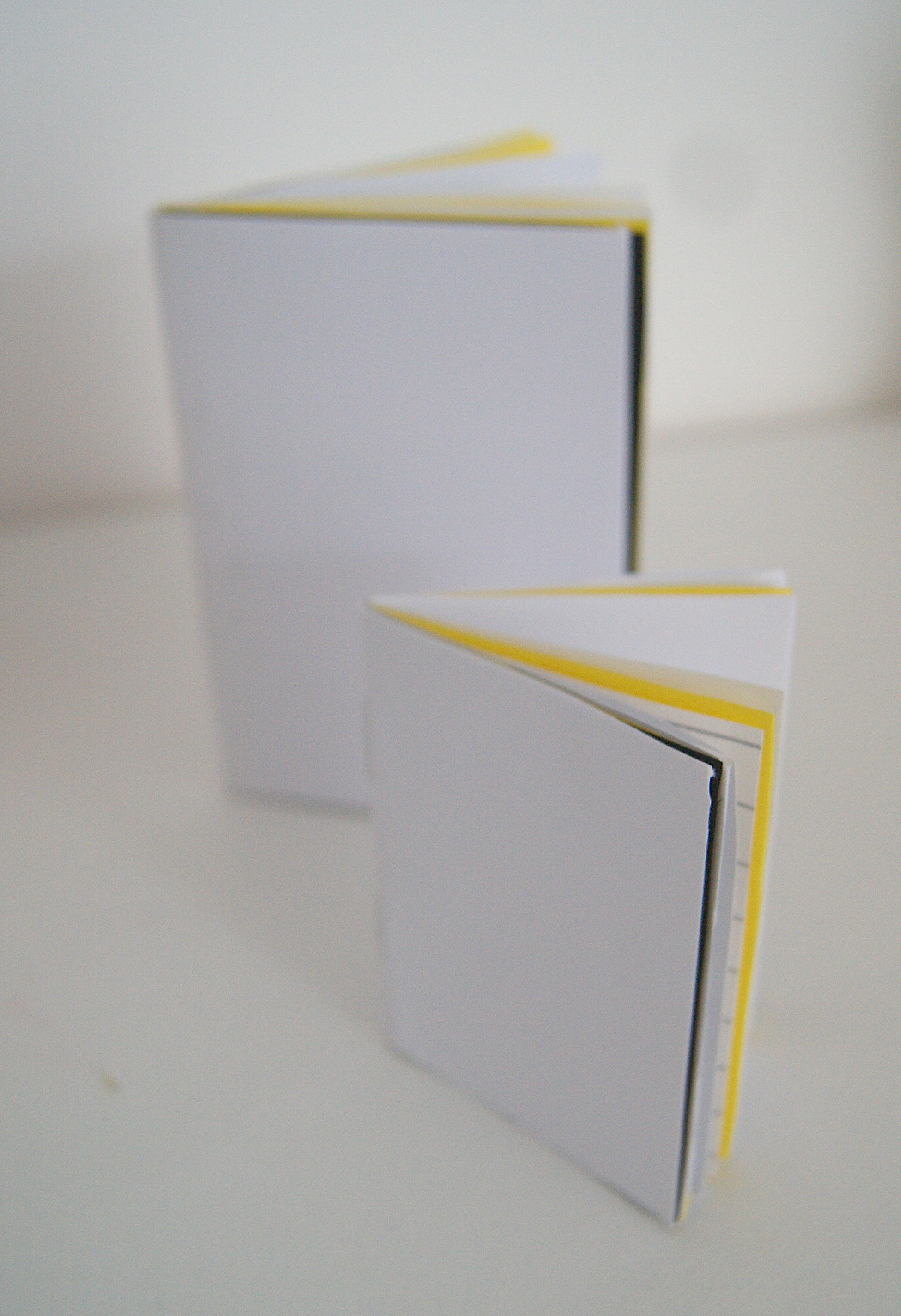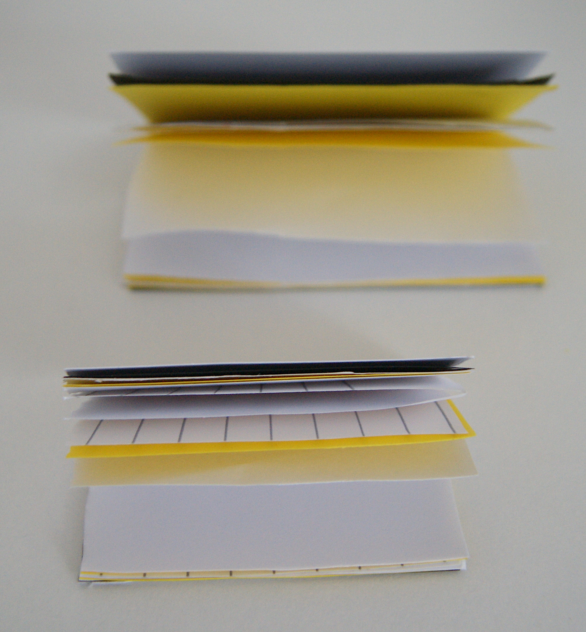 My ‘foldy’ sketchbook, I made an A6 and A7 (tiny weenie!) I used white card for the cover, black for the inner lining and a selection of lined, yellow, tracing & plain paper for the pages: