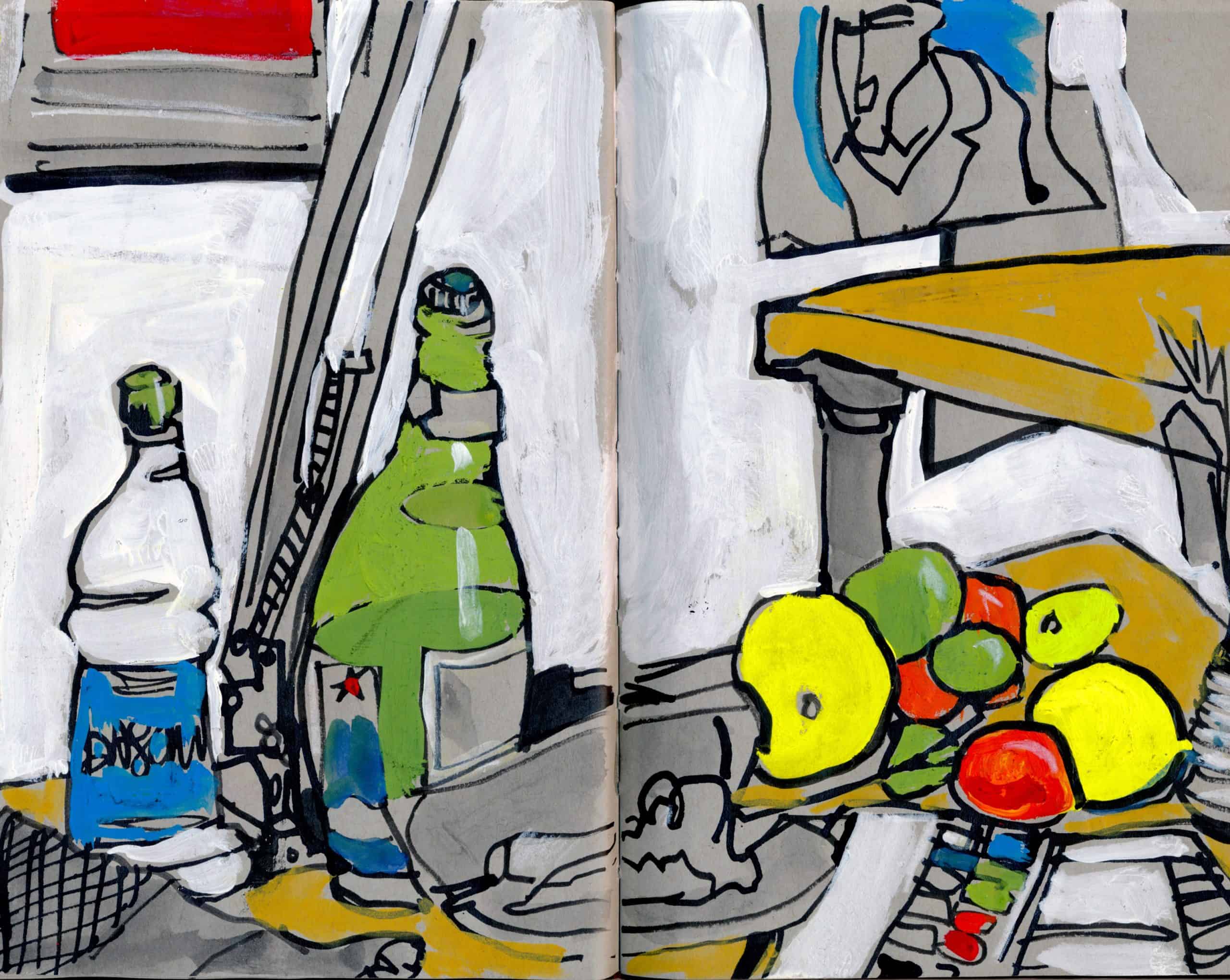 - The sketchbook is a landscape A4 pad with thick paper as he uses a lot of different media.