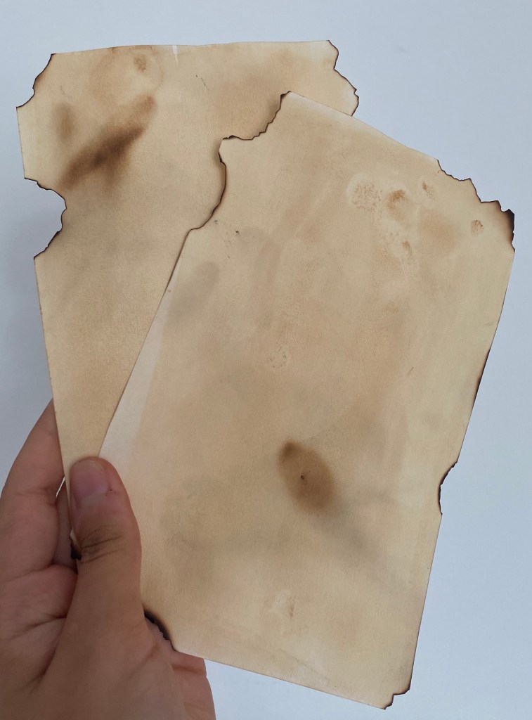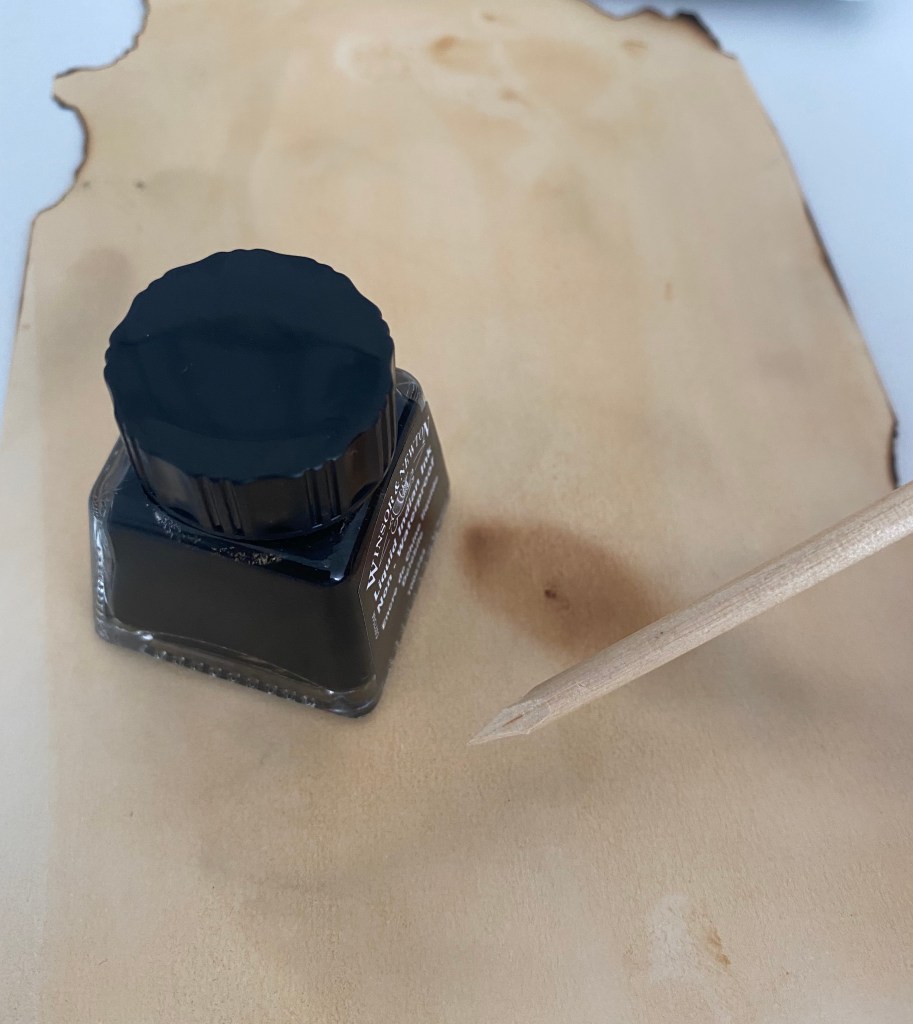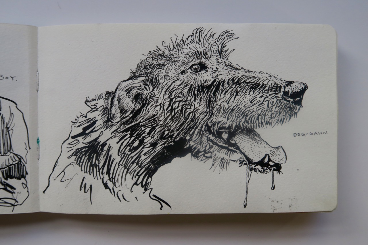 - The start of the sketchbook shows David using black ink pen, then as you go further into the book he starts to use what looks like tea from teabags to paint, then he uses watercolours and inks.