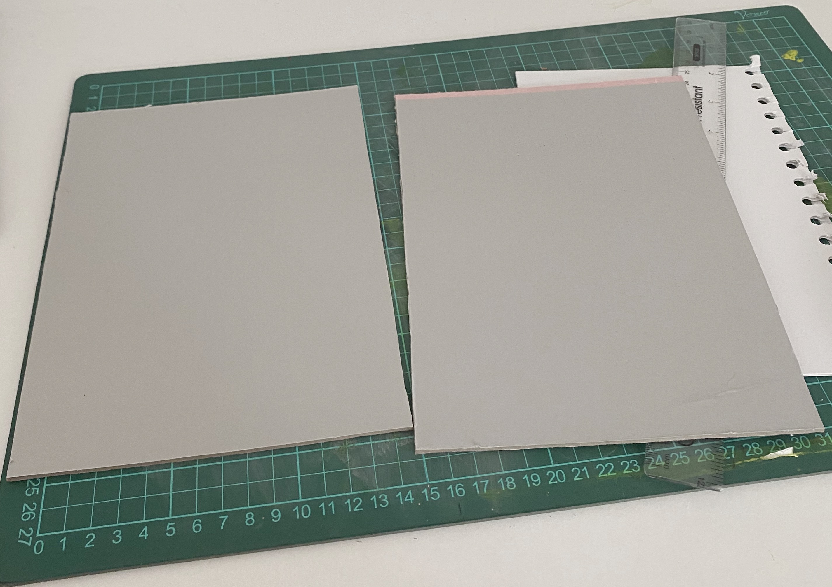 Next I measured two bits of card (from a previous A3 sketchbook cover) against the size of my sketchbook pages and added 5cm’s to each side so the cover protects the pages on all sides.