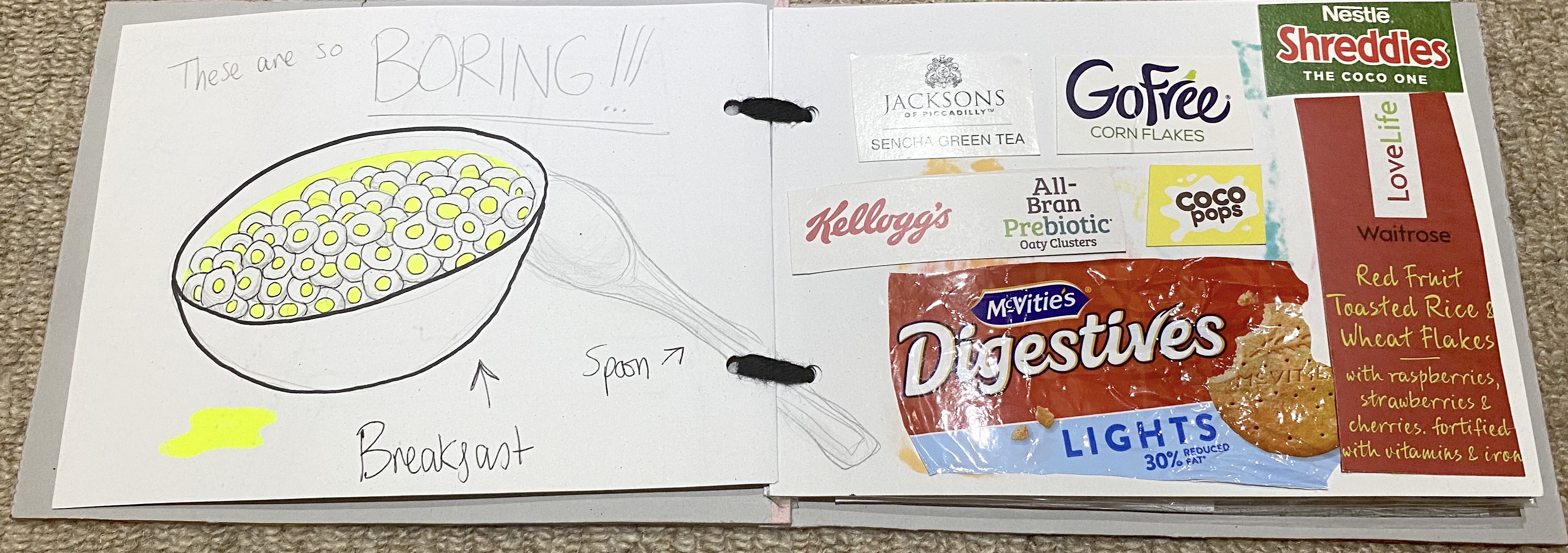 Next is breakfast, that she can see I decided to continue the use of the yellow highlighter throughout the sketchbook as I thought it really made the pages pop and certain aspects to stand out. I have also stuck on actual food packaging of what I normally consume.