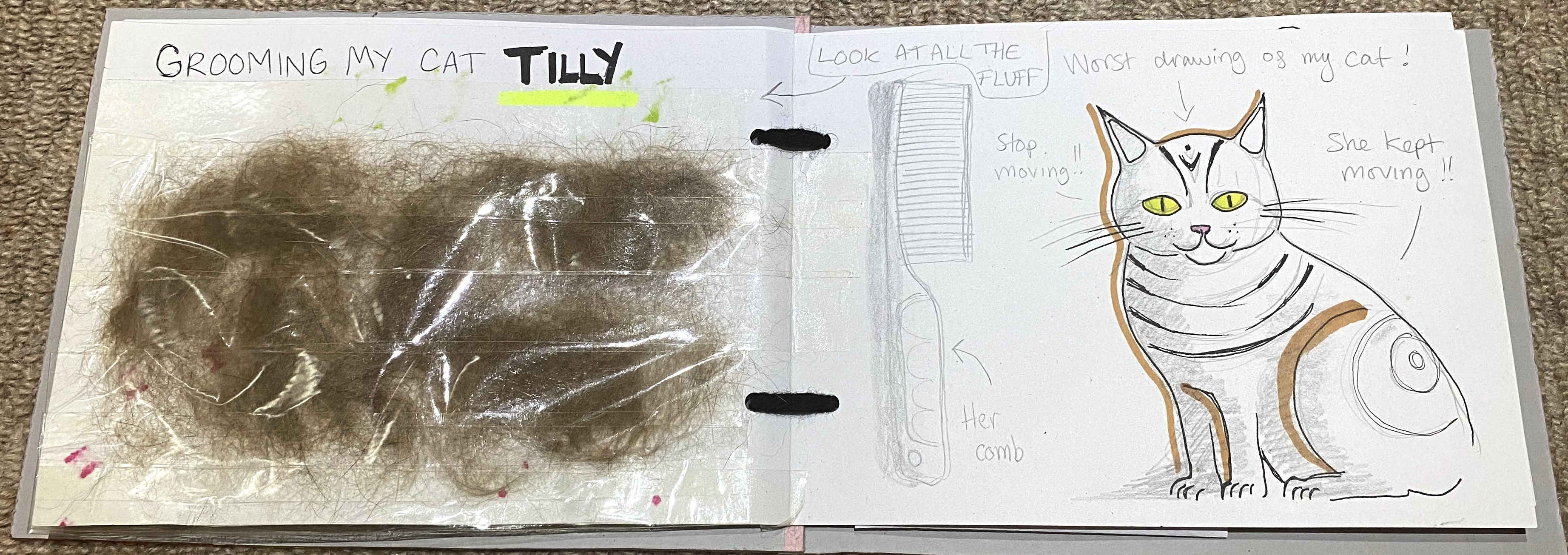 Next I spent time with my Bengal/Tabby cat Tilly, part of my routine includes giving her a good brush. Because of her breed she sheds a lot of fur so I decided to incorporate this in the sketchbook as a medium, I stuck the fur down with sellotape so that it didn’t go everywhere.