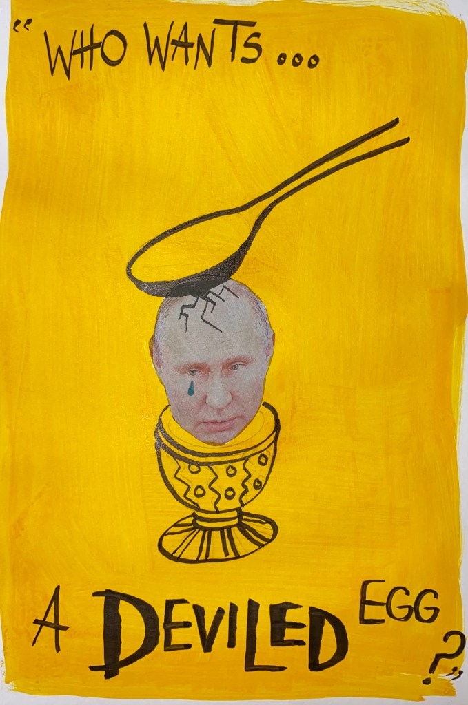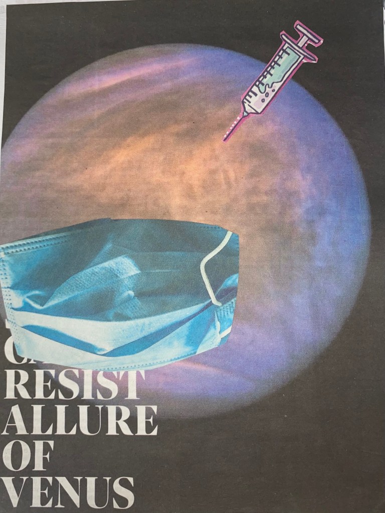 I find it fun to add a narrative to my art so the first page is of Venus having it’s COVID vaccine, this image is created by using just collaged newspaper.