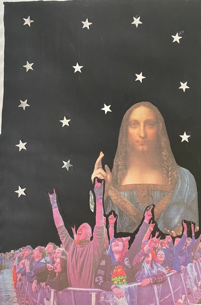 The second page shows Jesus at a festival, I chose to incorporate Jesus into the image as he looks like he’s doing the same finger sign as the other festival people! This image is made up of collage mixed with black acrylic paint and silver plastic stars.