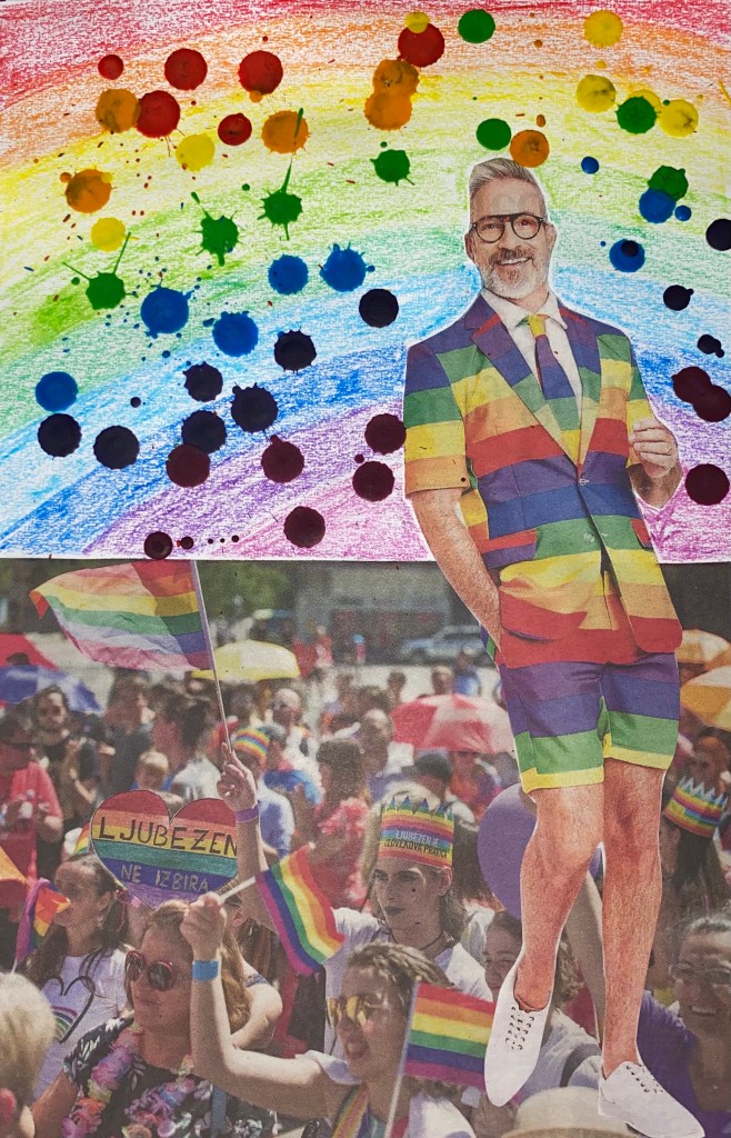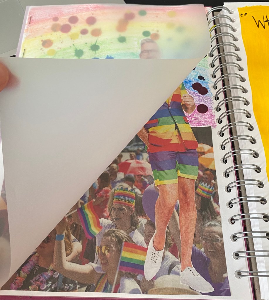 The third page shows Pride and in the foreground a man wearing an amazing Gay Flag outfit. I originally made the rainbow background using crayons but it didn’t seem special enough so I decided to think of how else I could use crayons, after some thought I decided to see what the outcome would look like if I were to melt them using a lighter. I found that really fun! 🙂