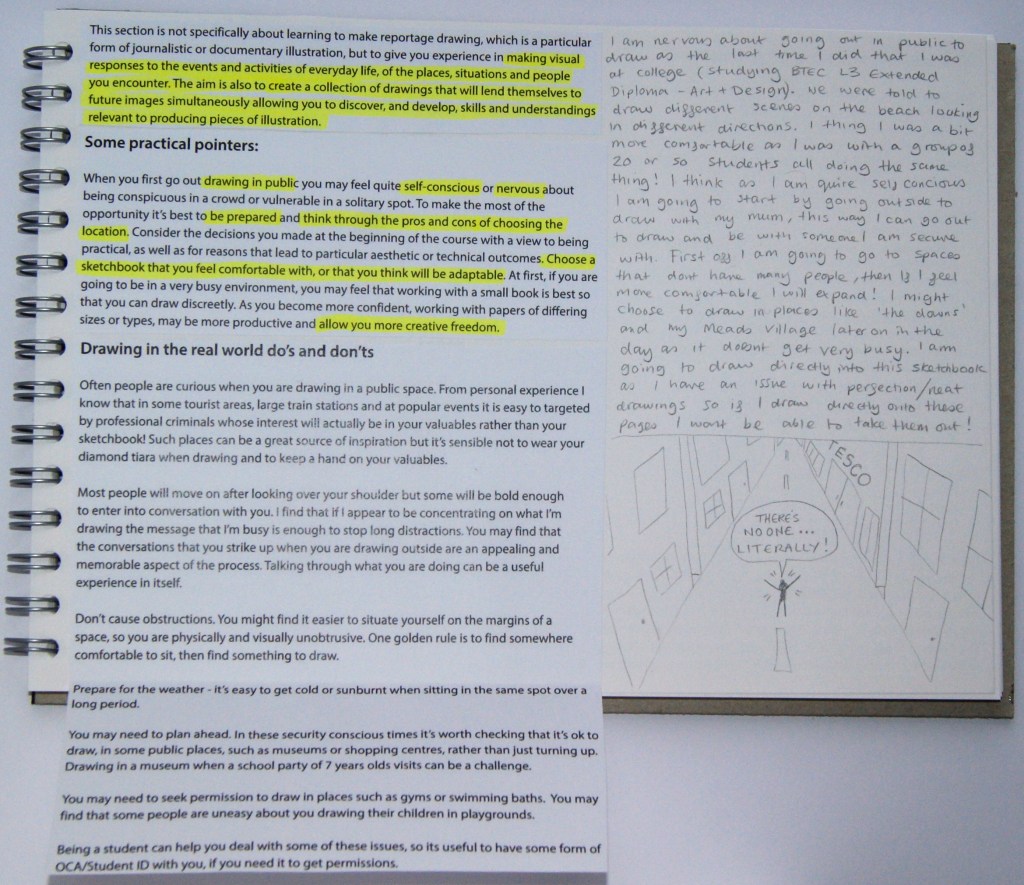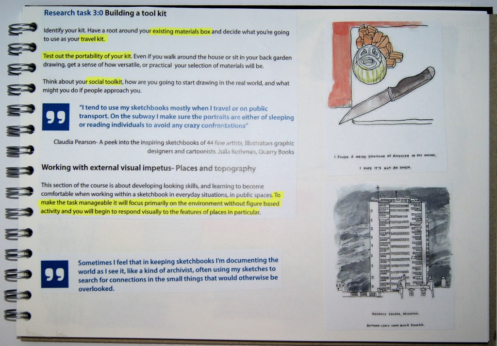 Before I started the research tasks and exercises for Part 3 I decided to go through the coursebook, read it all and highlight all the important information. Below are photos of parts that I have cut out and stuck into my sketchbook from the coursebook. On the first and second pages, I have also decided to write my thoughts on Jo Davies illustrations and how I responded to the idea of going out to draw.