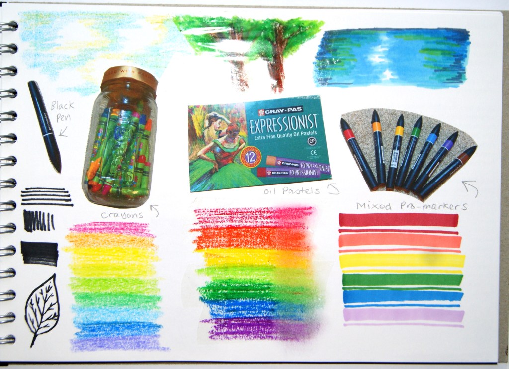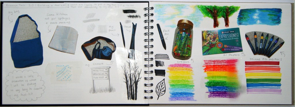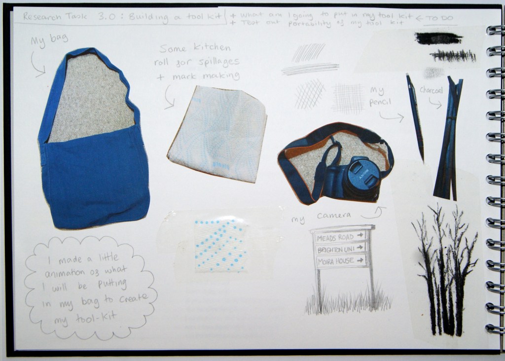 For my research task, I was asked to build a tool kit for when I go outside to draw in later exercises. Below are pages 4 and 5 of my sketchbook showing the items and materials I decided to add to my tool kit. I am going to take a loose, flexible bag so that I can fit in all my tools below without having to cram everything in.