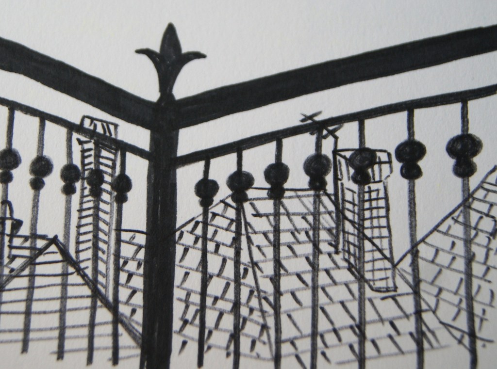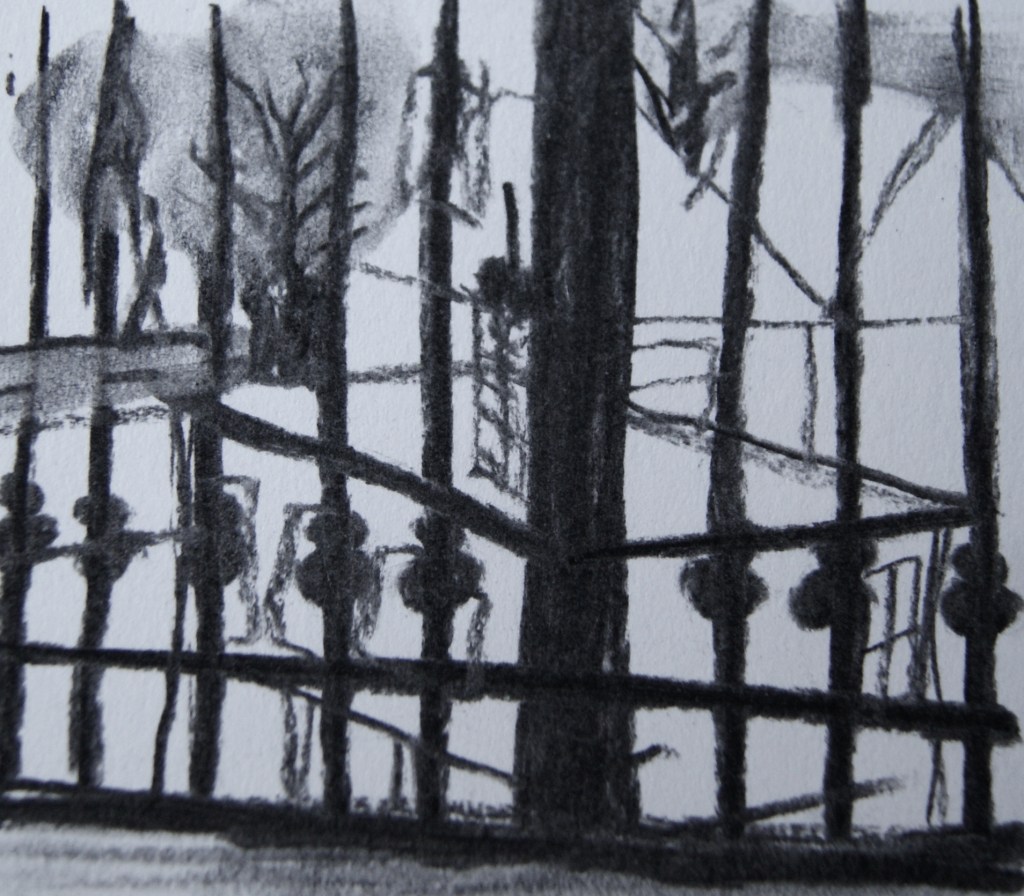 Her illustrations are very powerful and descriptive. I decided to recreate her illustrations by experimenting with different tools and materials including charcoal, thick black pens, and brown watercolour. I decided to recreate the images by looking outside my window and creating my own reportage illustrations, I then took some photos showing the places that I had drawn.