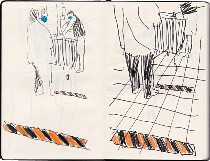 A: José Louro’s illustration is expressing the orange safety zones in a supermarket and shows where you should be standing in the queue to keep 6 feet apart. He is communicating the safety measures that were put in place in 2020 during a wave of COVID-19.