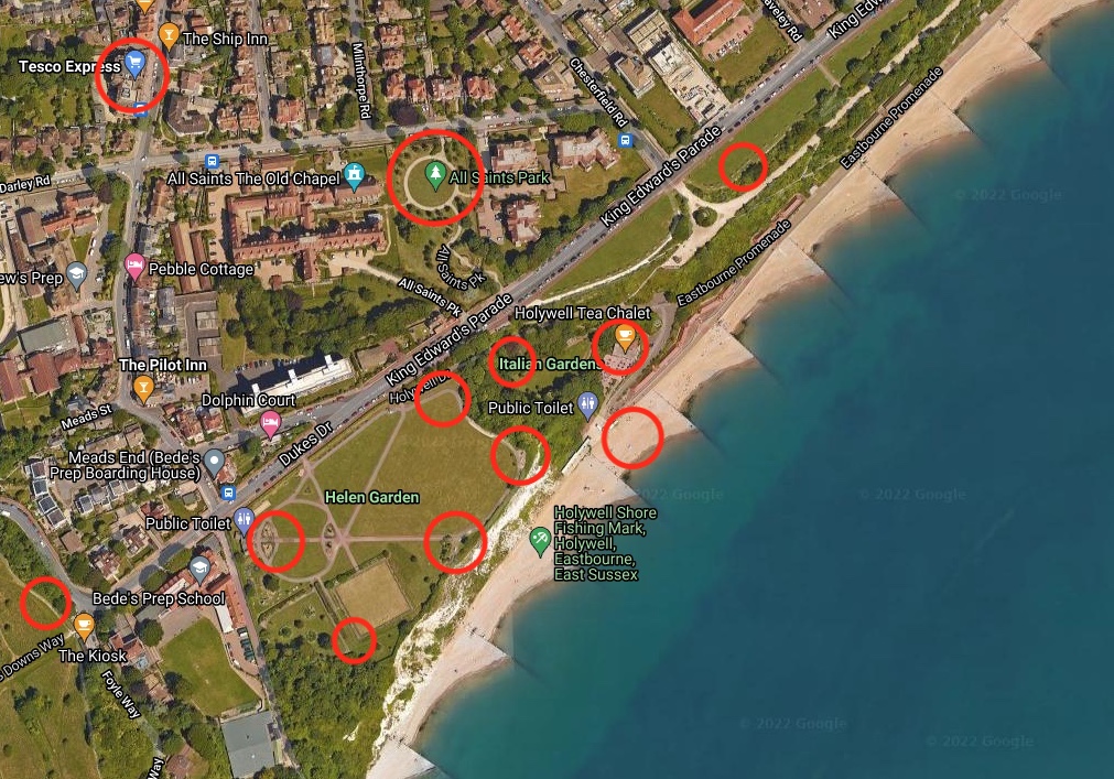 In the top left-hand corner (near Tesco Express) is my flat. Everywhere else that I have marked with red circles are the places (with benches) I will be drawing in.