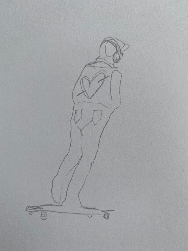 I firstly drew two sketches using just a pencil but then decided to incorporate the watercolour, I did this by drawing a rough line of the person and then using watercolour to fill in the detail.