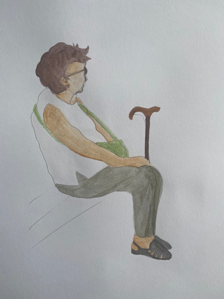 Annoyingly (after the first pencil drawings I did) I decided to focus on this old lady who was sitting on a bench with her walking stick as I thought she wouldn’t move anytime soon… I was proved wrong, she got up whilst I was half-way through painting her details, so I decided to leave her upper body blank.