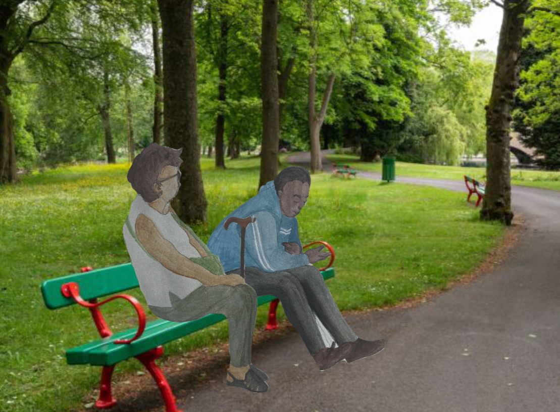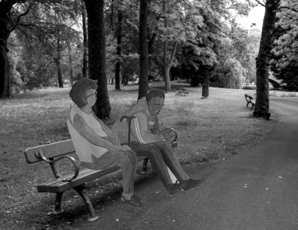 My Plan: I am going to combine the watercolour illustrations above with a photo I found off Google Images of a bench for the two people to sit on. I will adapt the image by turning the image of the bench and the watercolour people monotone to hopefully make it all fit in and before more natural, and finally, I will modify the image by changing the scale of each watercolour figure to match the size and proportion of where they are in the image (to fit on the bench).