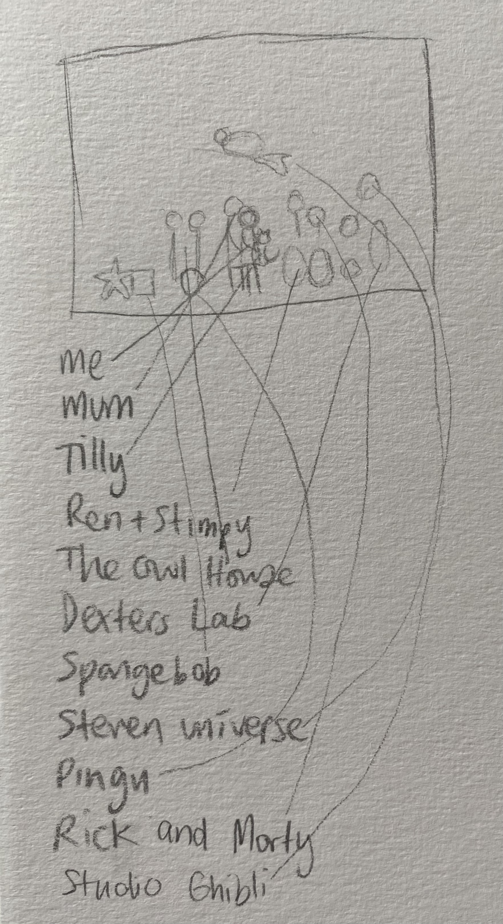 Next, I will write a 100 word personal statement that describes cartoons I used to watch and watch now as well as my visual interests. I will be creating an A3 image where I am in the middle of the illustration surrounded by the cartoons I like. I am using A3 as it was advised by the unit coursebook. Finally I will take a photo of my work and add it to this learning log.