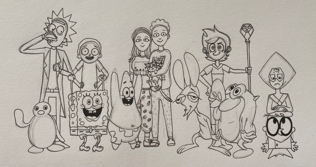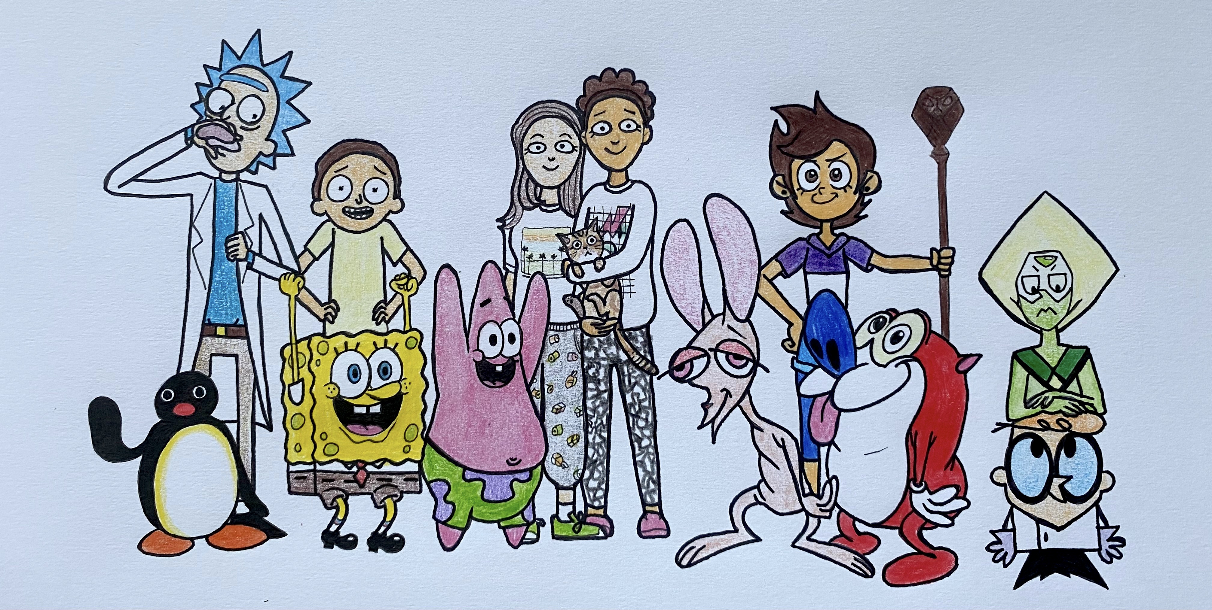 Overall I am really happy with how my first assignment turned out. It really was nice drawing all the cartoons I grew up with again as well as the ones I still watch. I rarely draw other people’s cartoons any more as I am trying to find my own style and feel like I could rely to much on other people’s art styles. I think this image really does sum up a lot about me and my interests. I decided to add my mum and my cat into the image also as they are important to me. It was strange trying to get all the characters in the same image as I had to think about how tall or short they were in comparison to the other cartoons e.g. Pingu (small) and Rick and Morty (tall). I changed my mind about drawing the witch in the air above all the other characters from ‘Studio Ghibli’ as I thought it might be too hard to draw in comparison to the other cartoons that I have drawn. If I was to change anything it would be to stick with my original line art (with colour) instead of the thicker line that I added at the end, I feel as though I the thicker line made the image a bit messy and in some places the pen I used has bled and made the line unequal.