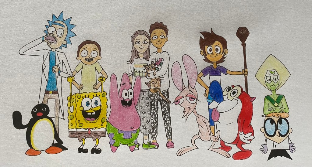 “My name is Tabitha and this portrait shows me with images of my interests. I am 24 years old, mixed race, live with my mum Natasha and cat Tilly and love Illustration, Photography and Graphic Design! Cartoons have been always such a massive part of my life, especially during my childhood. I enjoyed watching a variety of shows such as SpongeBob SquarePants, Pingu (although that’s more of a stop motion), Dexter’s Laboratory, Ren and Stimpy and Studio Ghibli Films. I enjoy giving newer shows a chance as well so I have been watching The Owl House and Rick and Morty.”