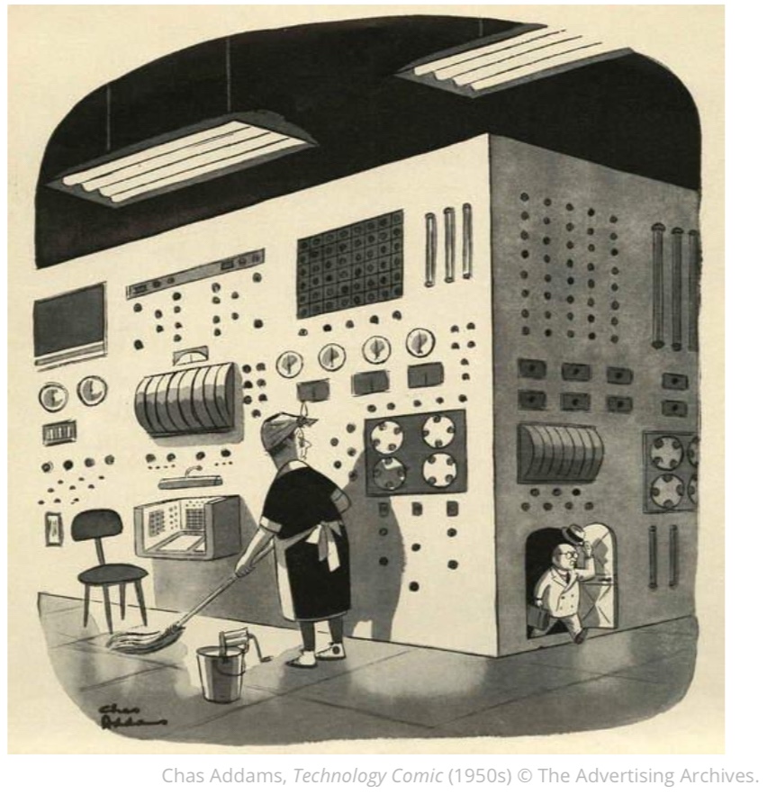 Subject: A cleaner mops the floor of a laboratory and stares at the tiny scientist exiting the inside of a large piece of machinery through a tiny door.