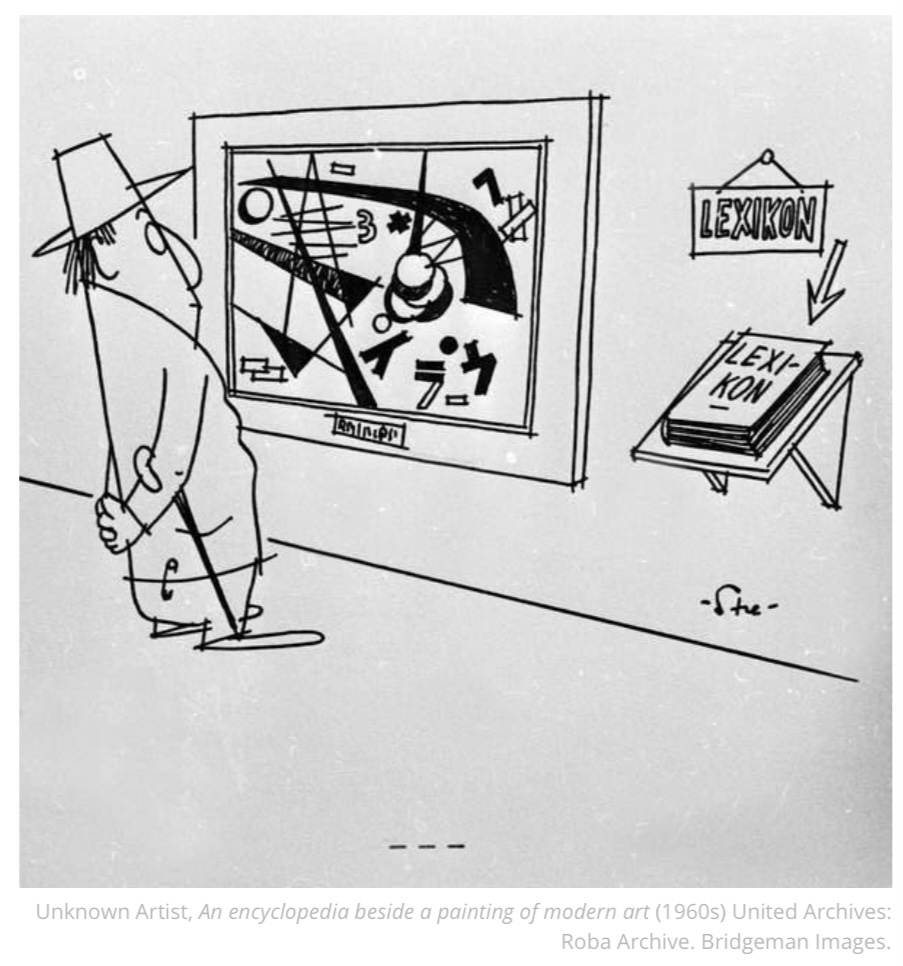 The style is linear. The illustration is in black and white. A man stares at an art piece displayed on the wall of a gallery. The man is wearing a hat and is carrying a walking stick on his arm. He has a slightly intrigued or surprised expression on his face. The art piece is a modern design, filled with numbers, circles and lines. Next to the art piece is a book displayed on a shelf, there is a sign above with the name ‘Lexikon’ in capital letters. There is an arrow pointing to the book from the sign.
