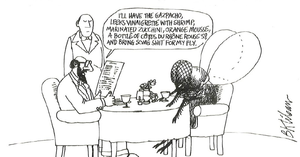 A man and his man-size fly companion sit at a table in a fancy restaurant. The waiter takes the man’s very well-chosen order of a variety of fancy food and expensive wine, he then goes on to order for his fly companion, the fly wants some shit.