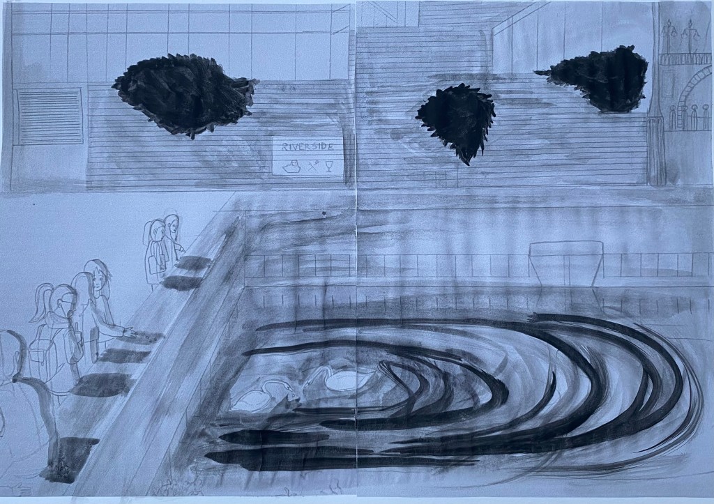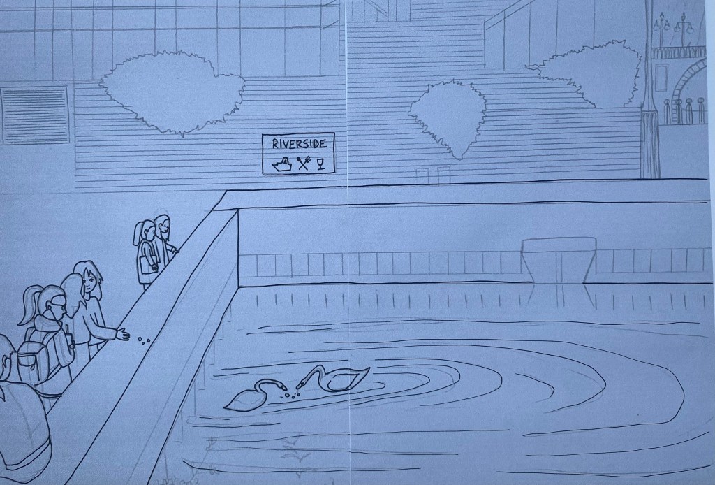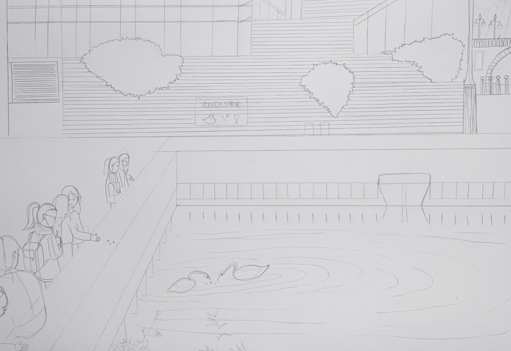 For this exercise, I was asked to draw an A3 pencil drawing. I chose to draw from a photo. I had to choose a photo where a lot was happening in it (a lot of details containing people, objects, and buildings). I looked through my past photos saved on my laptop and one stood out to me as being perfect for this exercise. It’s a photo of university students at Kingston Upon Thames looking at a couple of swans near the riverside. I chose this photo as I liked the composition and thought it would be a challenge.
