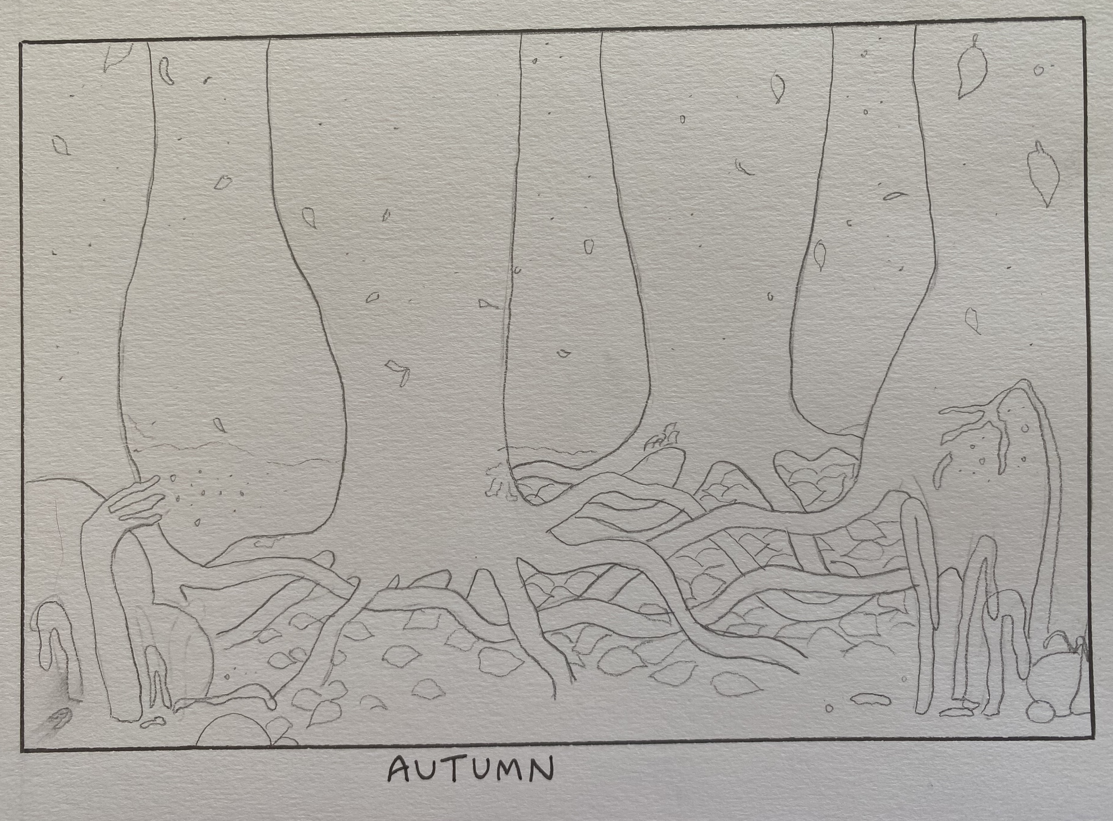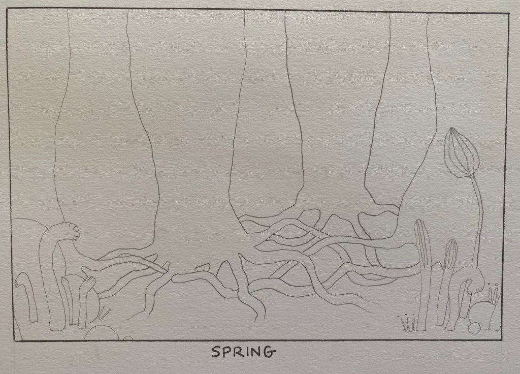Now I will draw in detail and colour in, each of my four panels as if it is set in the four seasons: