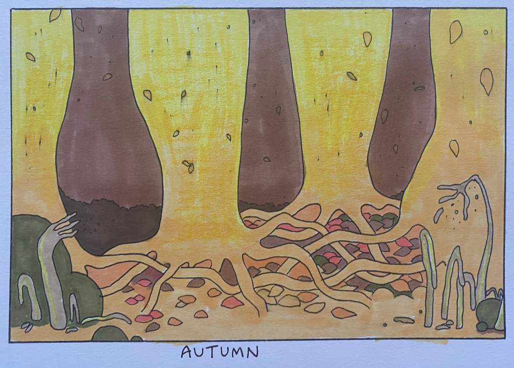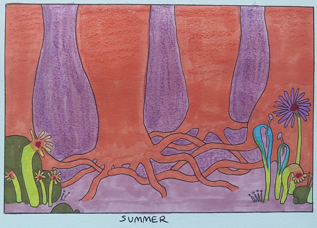 I found this assignment hard but fun to do. I had to really think about what I wanted to use for my scene and when I decided on an alien forest I was happy with my decision. I knew I could use a lot of different and interesting colours to show the changes in the seasons and how they are different but similar to the seasons on Earth. I wanted to show the seasons by showing plants growing and then dying and that cycle of life.