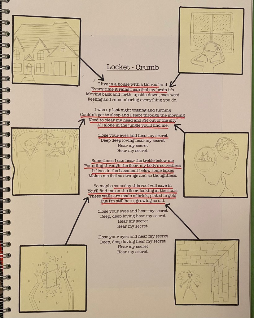 Evaluation: This exercise was really fun, I enjoyed finding one of my favourite songs and drawing the first image that came into my head for each verse of the song. I think if I were to adapt this exercise further I would maybe spend some time doing a psychedelic animation to go with the song.