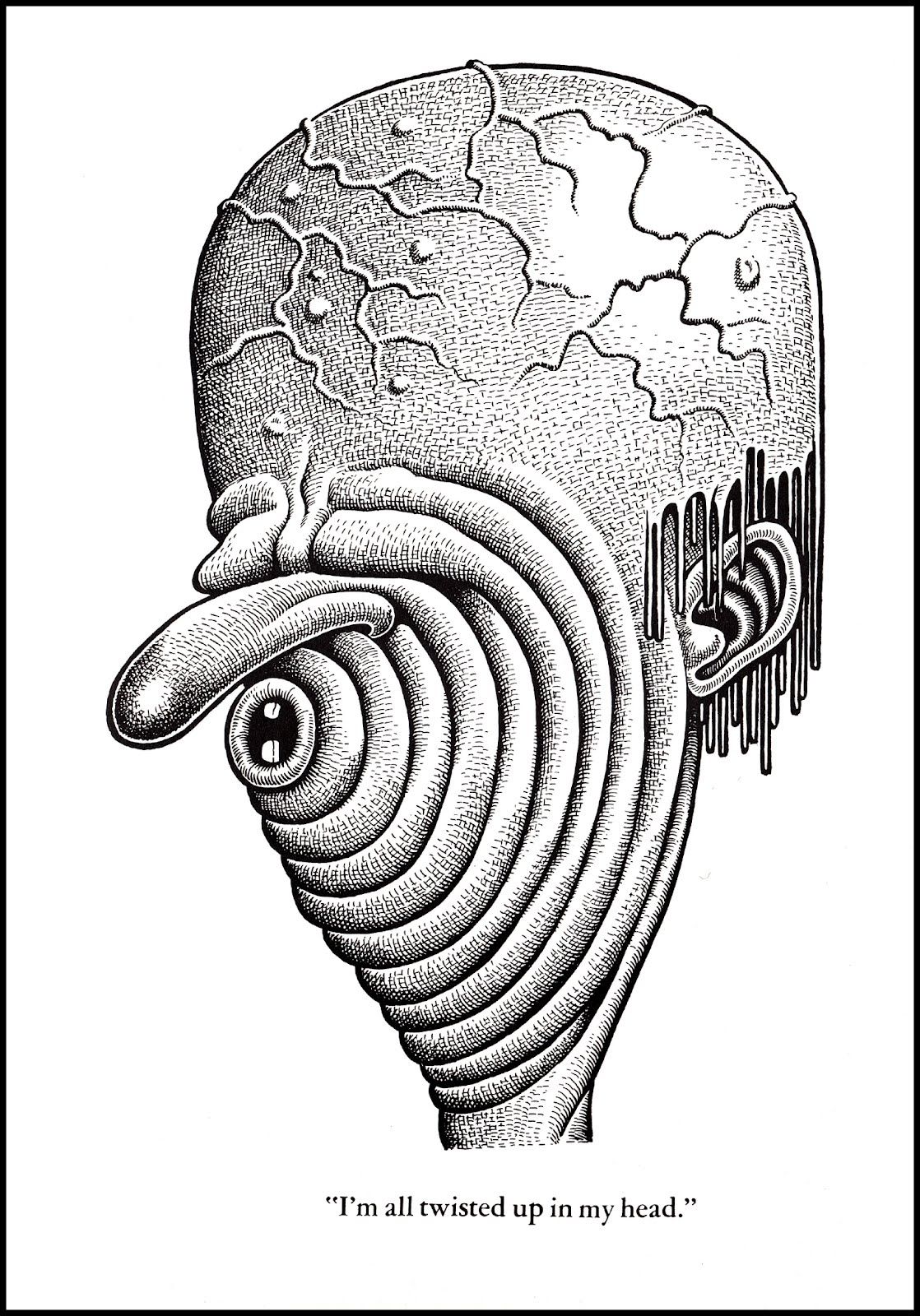 Basil’s art style relates to the content of his stories because his art style is very detailed but abstract, his text is very connected with his illustrations. There is a lot of dramatic overly-expressive emotion within his work it is also quite grotescque. The shading and stippling tecniques that he uses really adds to his unique style, some of his work is so detailed it almost looks as if it’s printed.