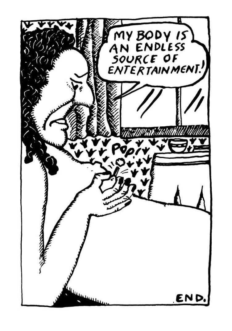 Kominsky-Crumb’s work is mostly created without colour. The style is very ‘old-fashioned’ and quite similar to the style of Milt Gross’ work from the 1930’s, it looks like she mainly uses ink. Her work is quite vulgar and indecent, maybe she is trying to please a certain audience…