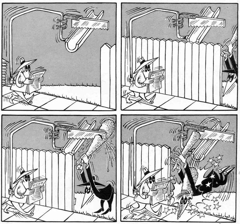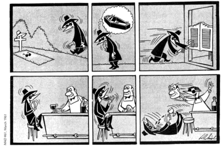 In 1959 he was the president of the Cuban Cartoonist Association. In 1960 he worked in a garment factory by day and built a cartoon portfolio for ‘Mad’ at night, ten weeks later he walked into Mad’s offices unannounced and sold his first three ‘Spy vs Spy’ cartoons for $800. He told his 241st and last ‘Sky vs Sky’ strip before retiring due to illness.