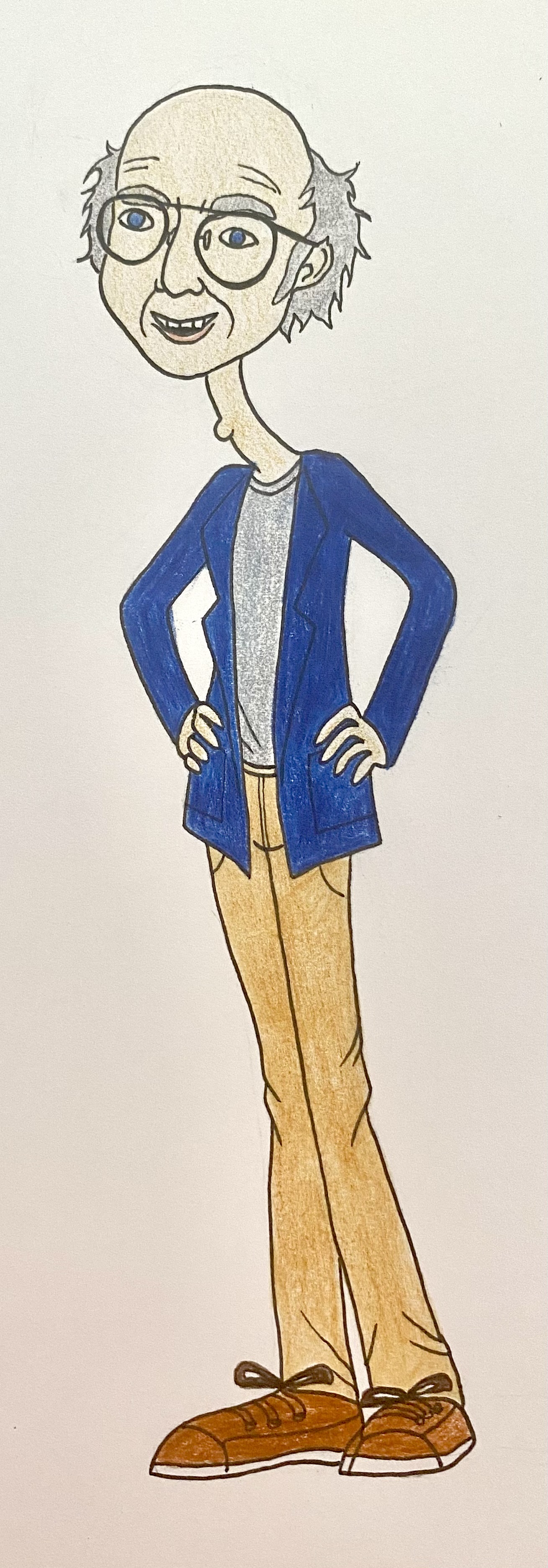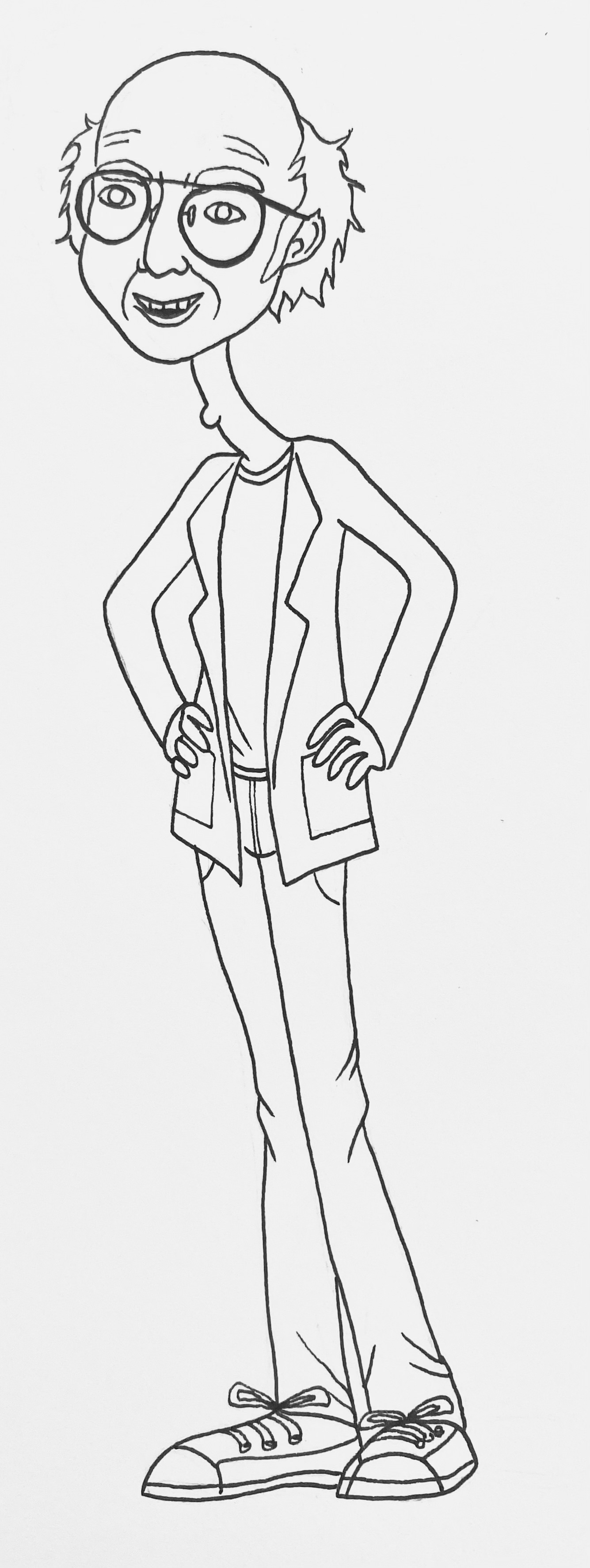 Overall I am quite happy with how this one turned out. Larry David is one of my favourite comedians, I especially like his show ‘Curb Your Enthusiasm’. I decided to draw Larry this way to show how lanky and tall he is, I also wanted to show his glasses, hair, and clothing choice. He is quite well known for his ‘Boring-Dad Look’ and this is shown also in ‘Curb Your Enthusiasm’ where he plays himself as his character ‘Larry’ where he wears his long sleeve t-shirts, cardigan, tan trousers, and Simple’s OS skate sneakers. He tends to also carry himself with his posture ‘head forward’.