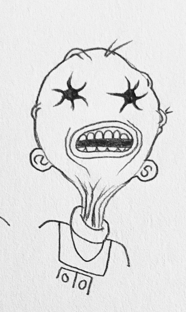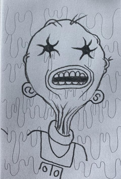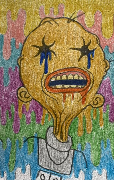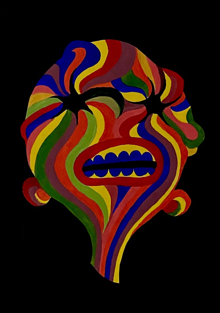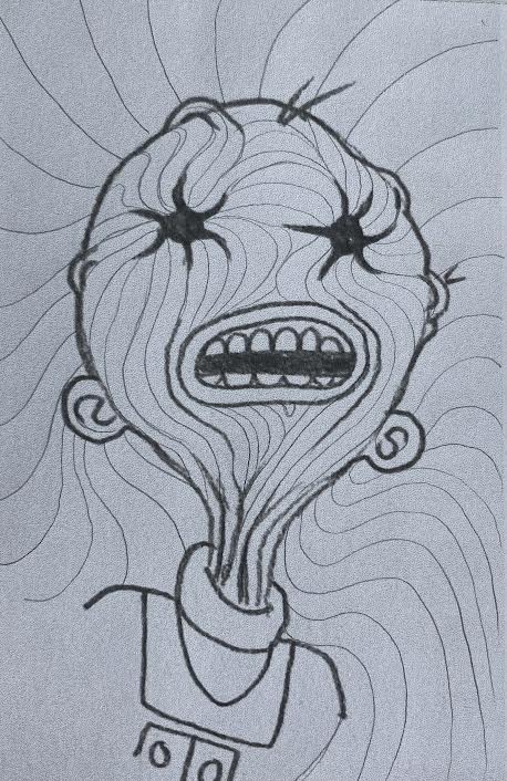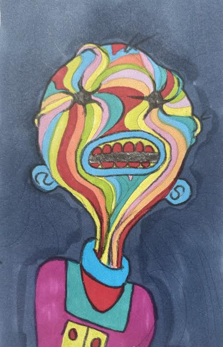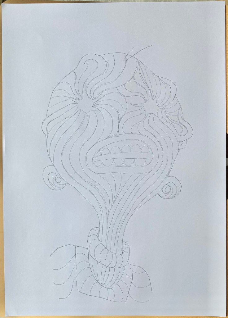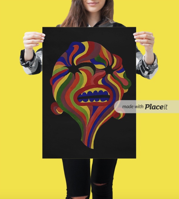 My final design is in A2 size to make it more wall-worthy! As this sketch was already so strange I wanted to focus on how I could make it stranger! I decided to focus on psychedelic art styles to see how ‘trippy’ I could make this final artwork so that it could be a stand-alone piece on the wall. I focused on colours and linework. I finally decided to create a mock-up of my final design to show it on a wall.