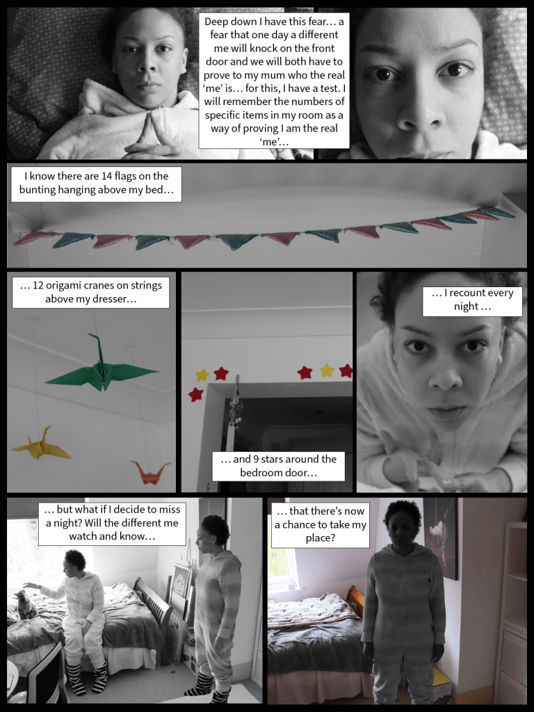 “Deep down I have this fear… a fear that one day a different me will knock on the front and we will both have to prove to my mum who the real ‘me’ is, for this, I have a test. I will remember the number of specific items in my room as a way of proving I am the real ‘me. I know there are 14 flags on the bunting hanging above my bed, and 12 origami cranes on strings above my dresser, I recount every night but what if I decide to miss a night? Will the different ‘me’ watch and know that there’s now a chance to take my place?”