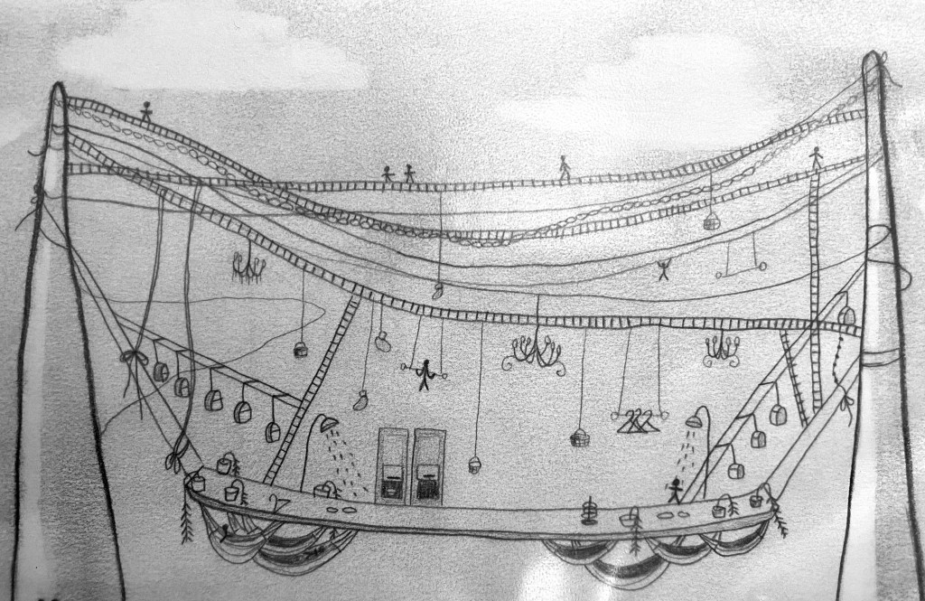 This is the foundation of the city: a net which serves as passage and as support. All the rest, instead of rising up, is hung below: rope-ladders, hammocks, houses made like sacks, clothes- hangers, terraces like gondolas, skins of water, gas jets, spits, baskets on strings, dumb-waiters, showers, trapezes and rings for children’s games, cable-cars, chandeliers, pots with trailing plants.