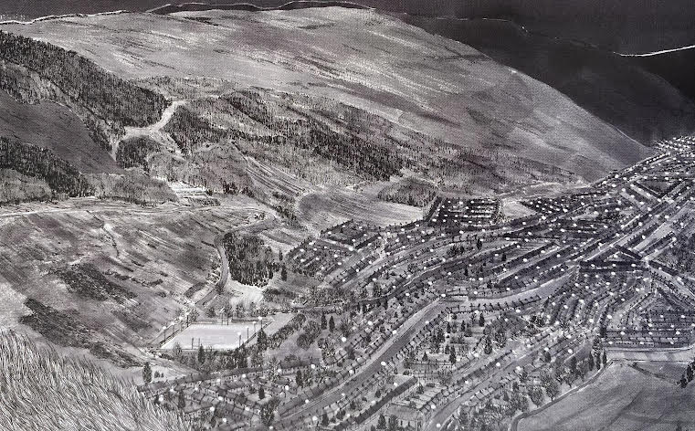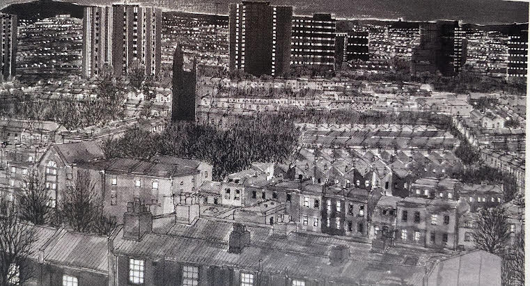 James’ art relates to the architecture through the use of line-work and the way he illustrates the busyness of the city. You can differentiate between the old and new buildings, as the new buildings are high-rise and the watercolour used is darker in comparison to the old buildings. The trees and landscape are less detailed and less pronounced which depicts a large flat expanse. The lightest parts of these illustrations are where the lights of the houses/flats are. It’s a great contrast. (84 words).