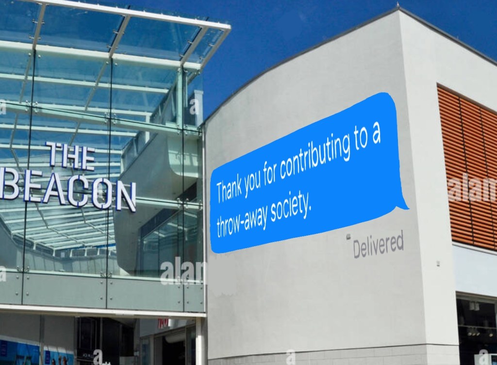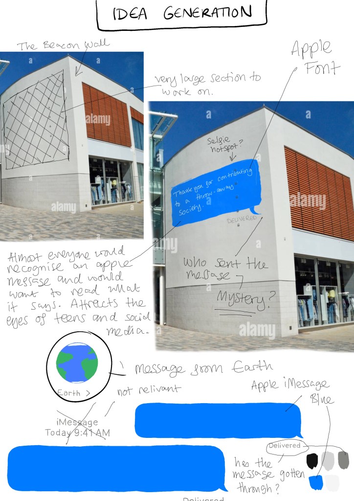 If a message needs to reach a lot of people it needs to be placed in a bustling area like a city centre or bus stop. I decided on my town shopping centre, The Beacon in Eastbourne. There is a large white section that was never completed and I saw it as a massive opportunity for street art… of course I’m not actually going to do anything to the building but I will do a mock-up of it digitally.