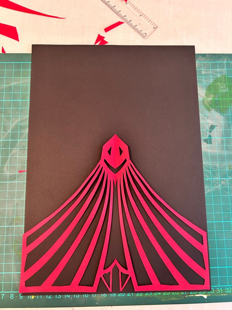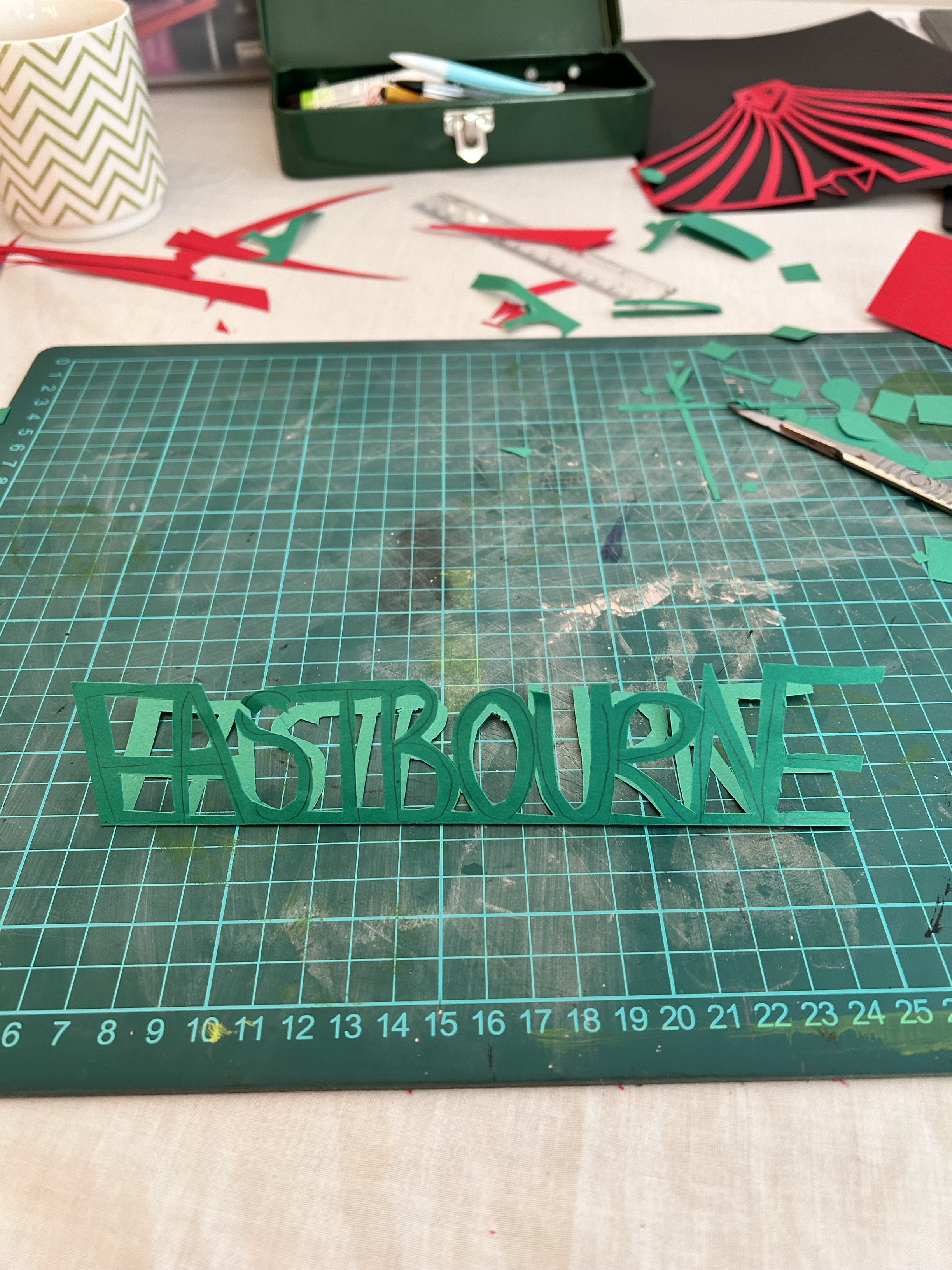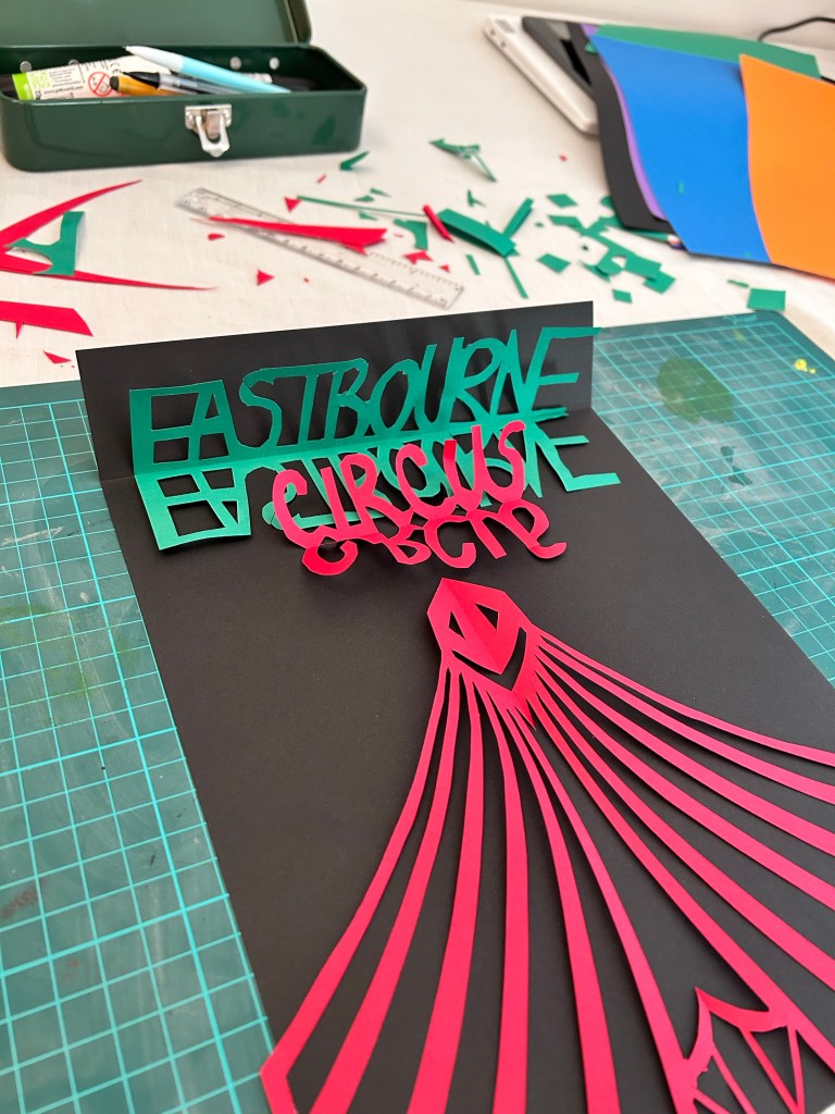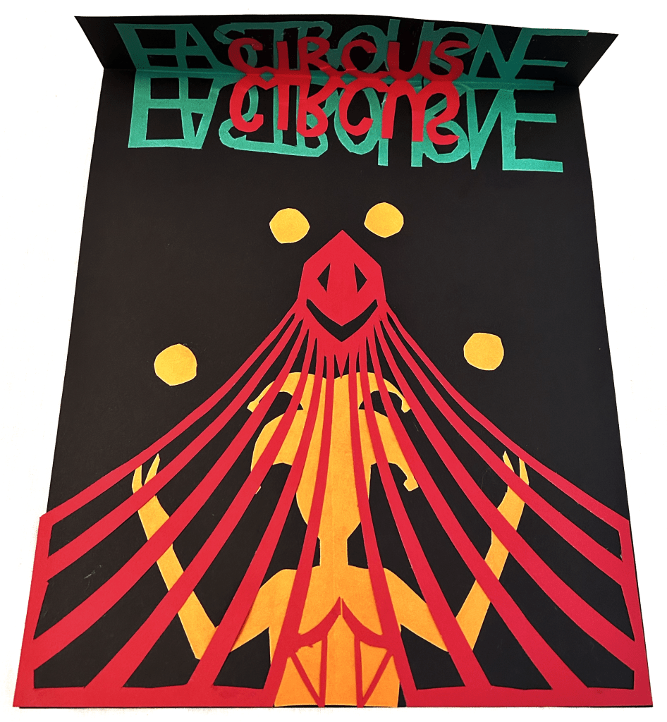 I used a scalpel for this exercise primarily but used scissors for some of the text as there were many curves. I think my final design stands out and would catch peoples eye. For the text/typography I wanted to focus on the ‘illusion’/mirrors part of a circus so for this I cut out the text with a mirrored version attached to it. I then overlapped the work circus on top of Eastbourne, this way the colours green and red would clash making it seem confusing and give a ‘dizzy’ 3D sort of effect. For the jester and the tent I folded my paper over so I cut out one side only and mirrored the design when I unfolded the paper. I showed the jester juggling some balls as well to really define what the image is trying to show. Looking back I suppose the tent could be mistaken for a jail cell with the jester behind? The only downside to this is that because of where I put the tent doors, it looks like the jester is wearing a bra!