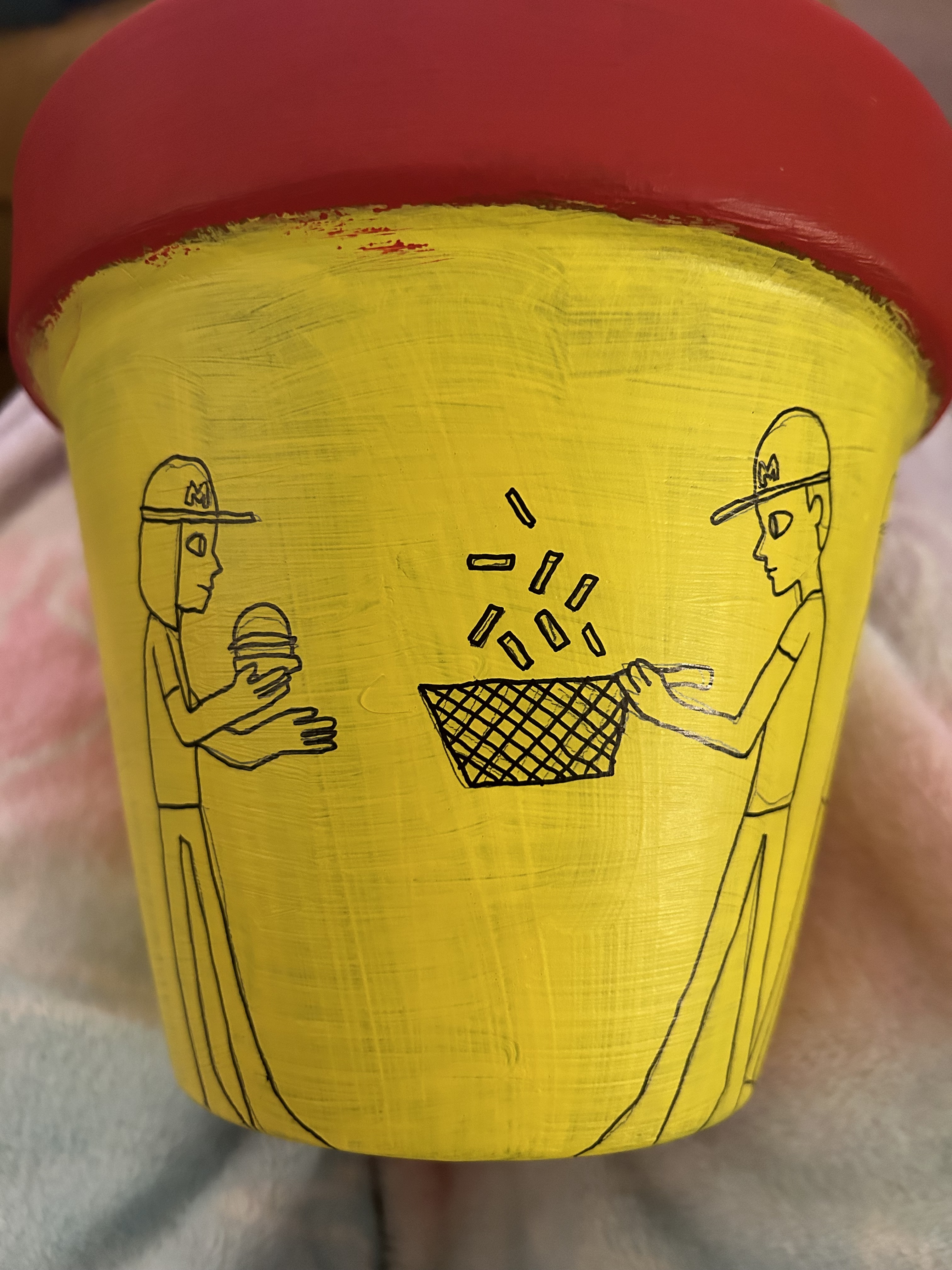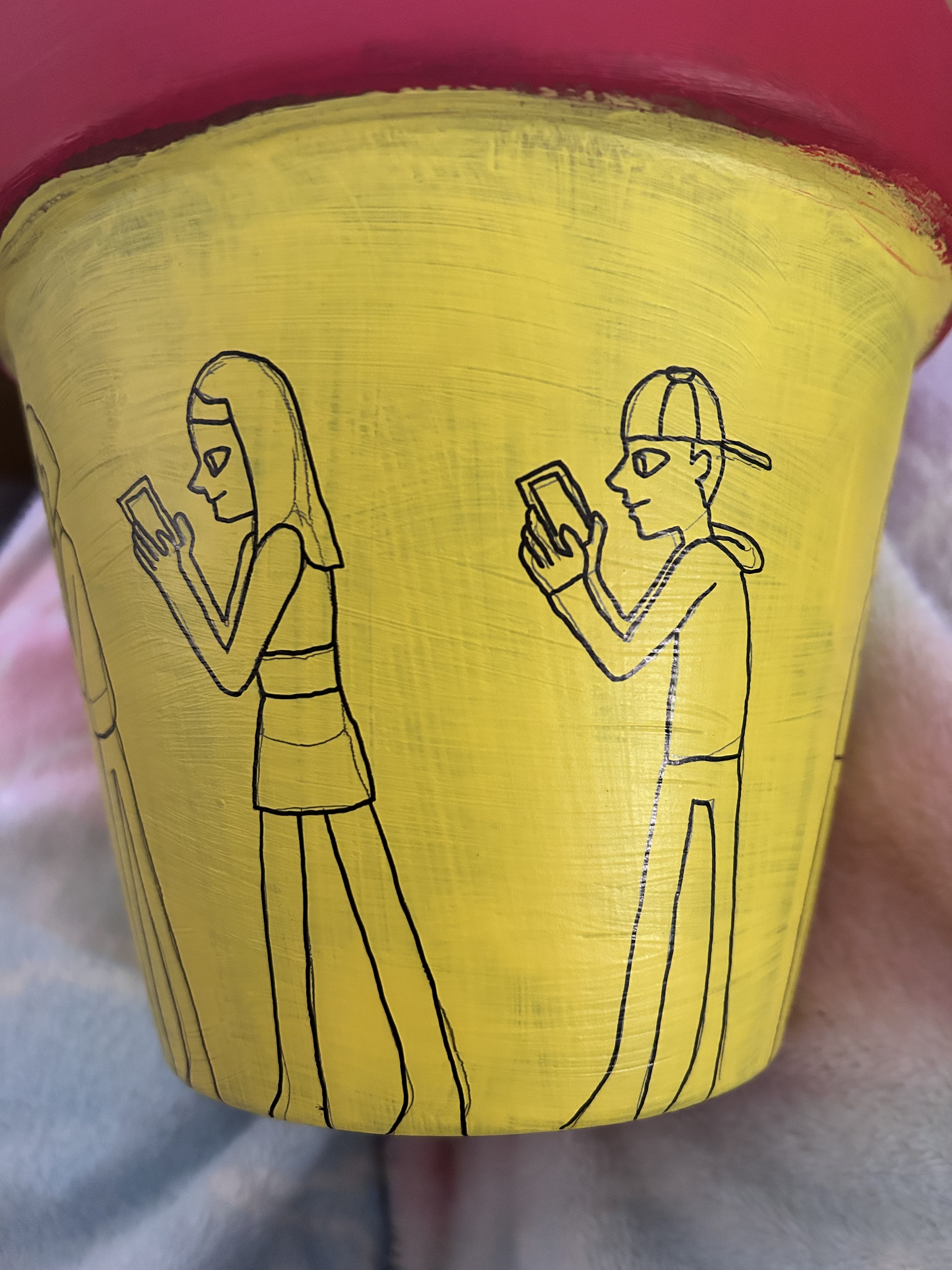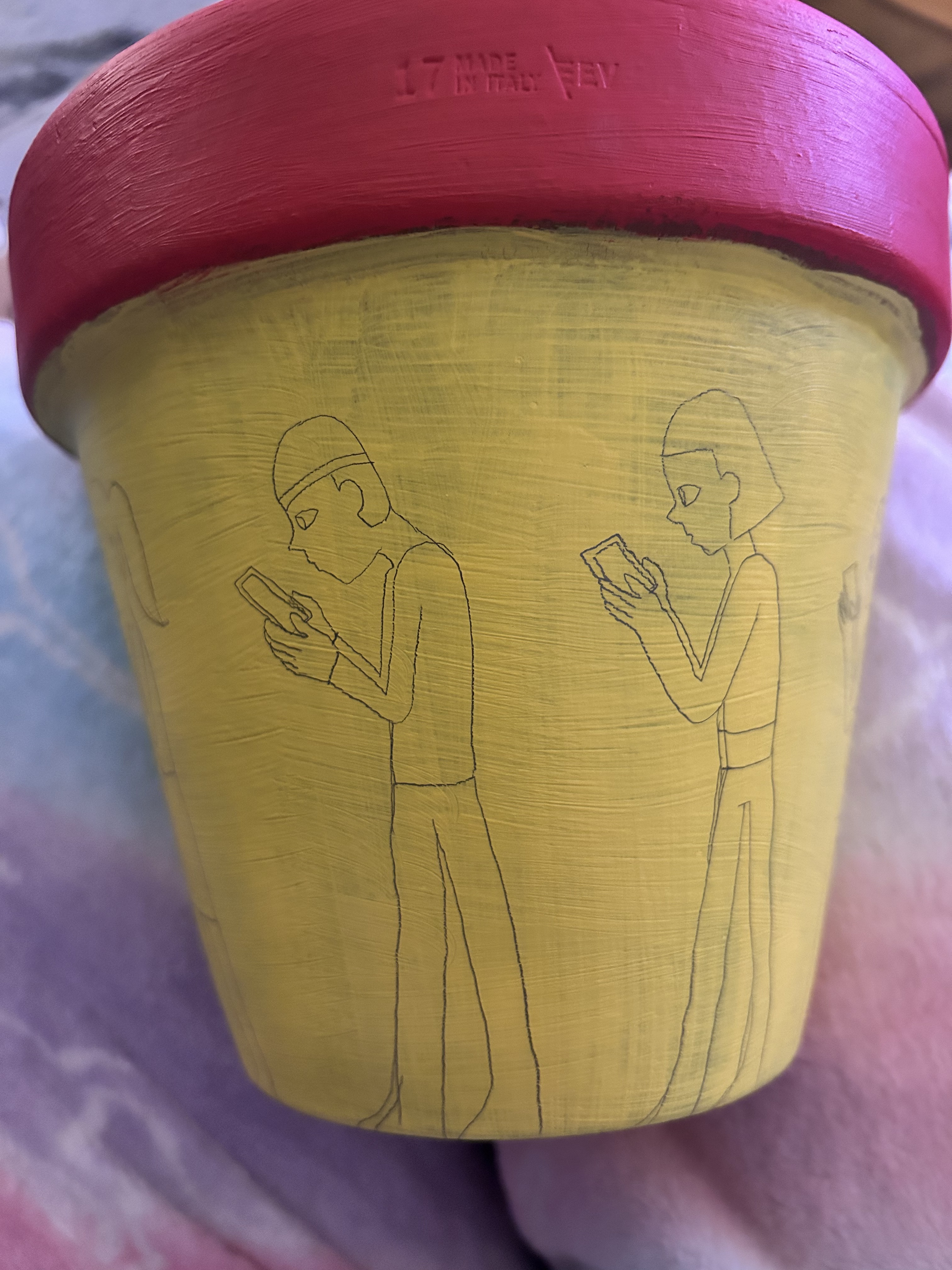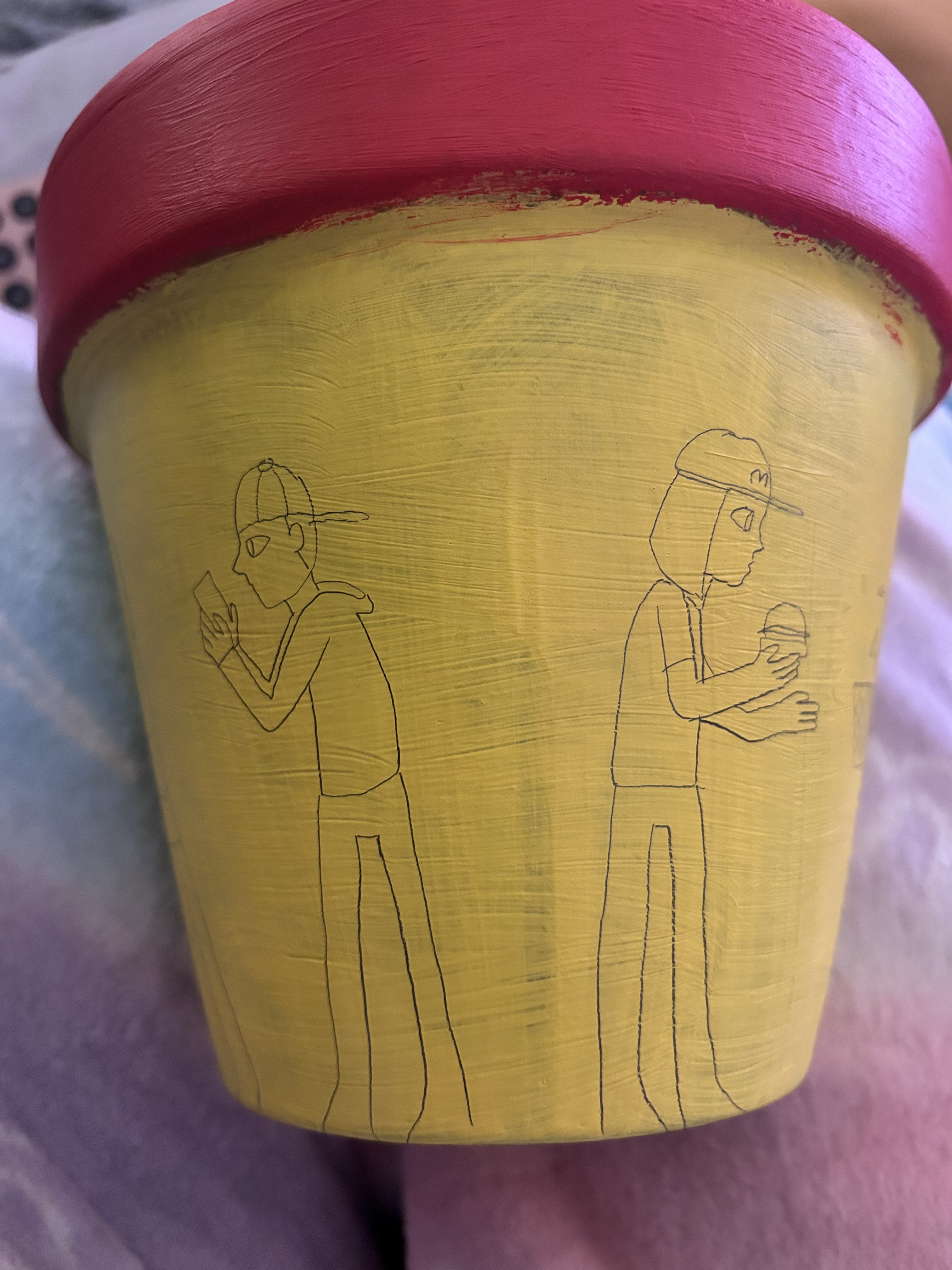 Red and Yellow painted terracotta pot with pencil sketches of design: