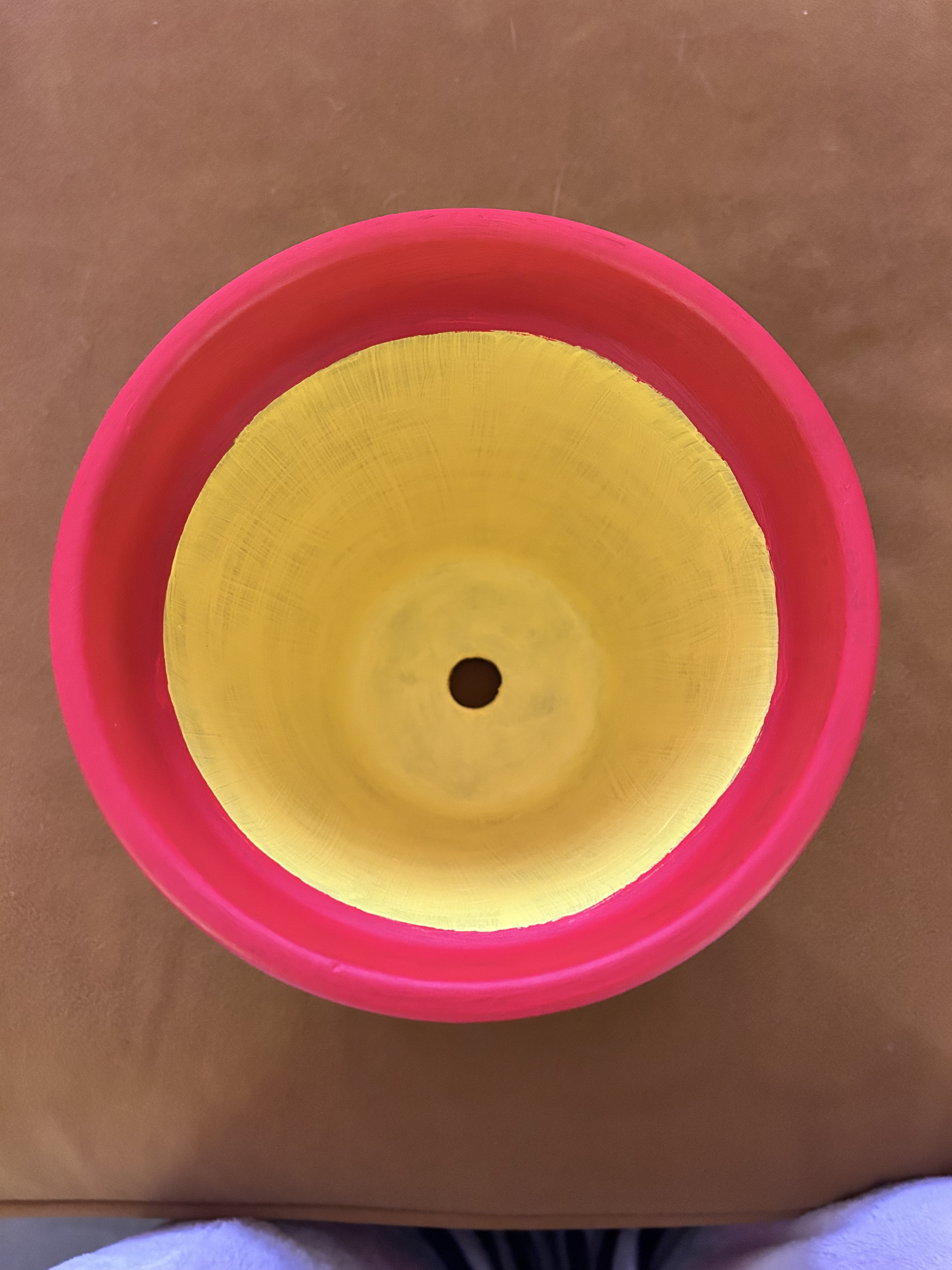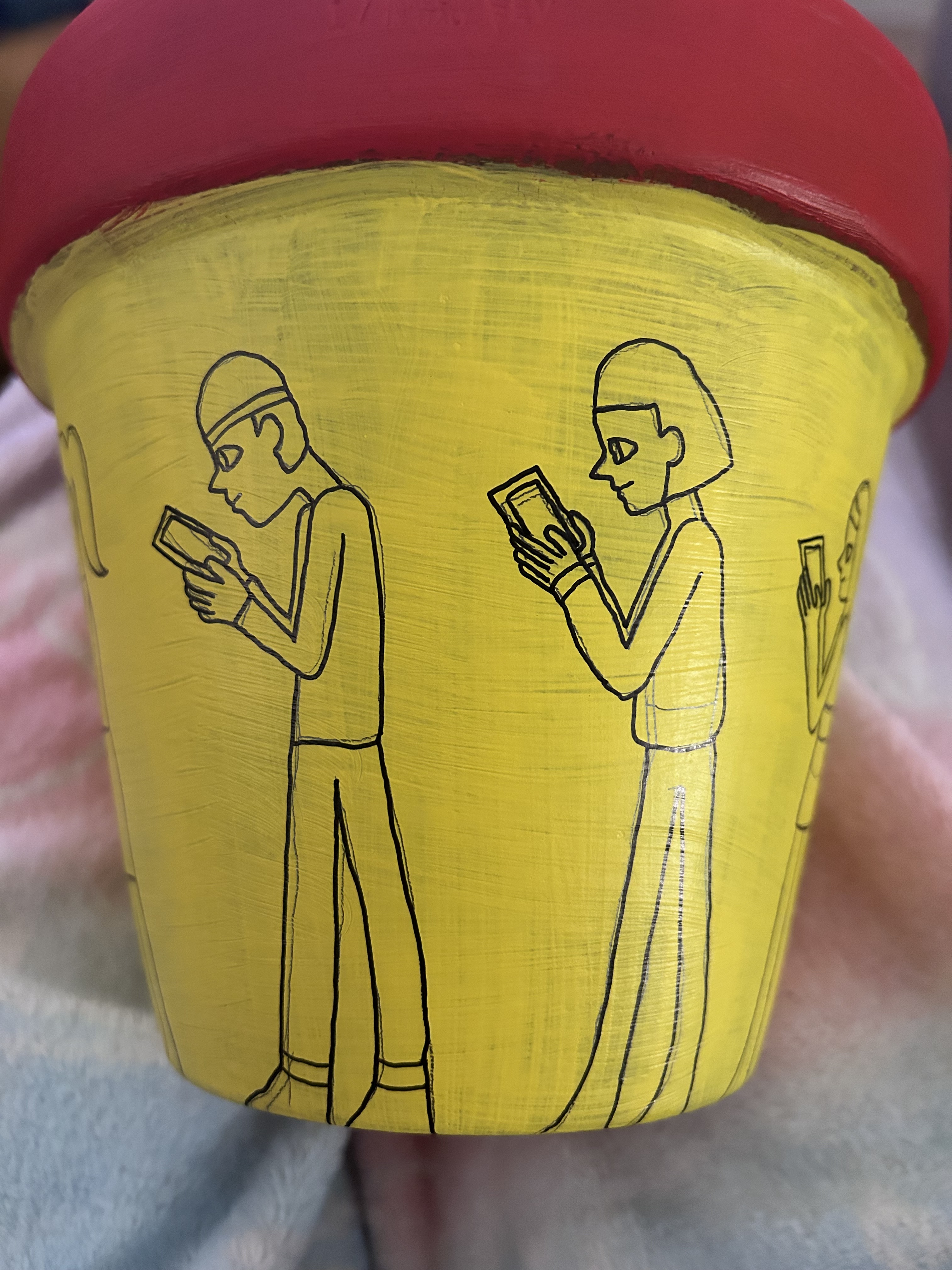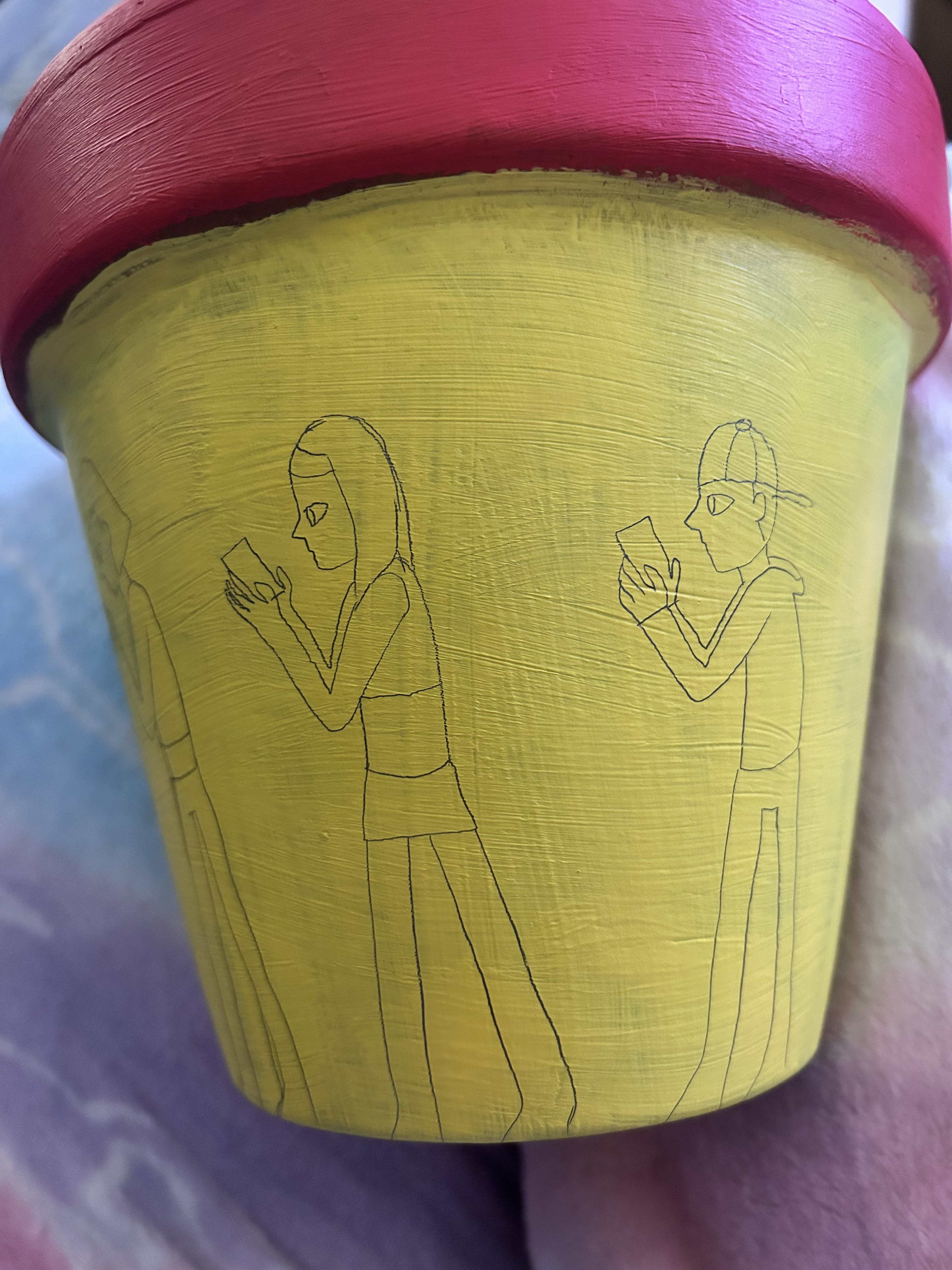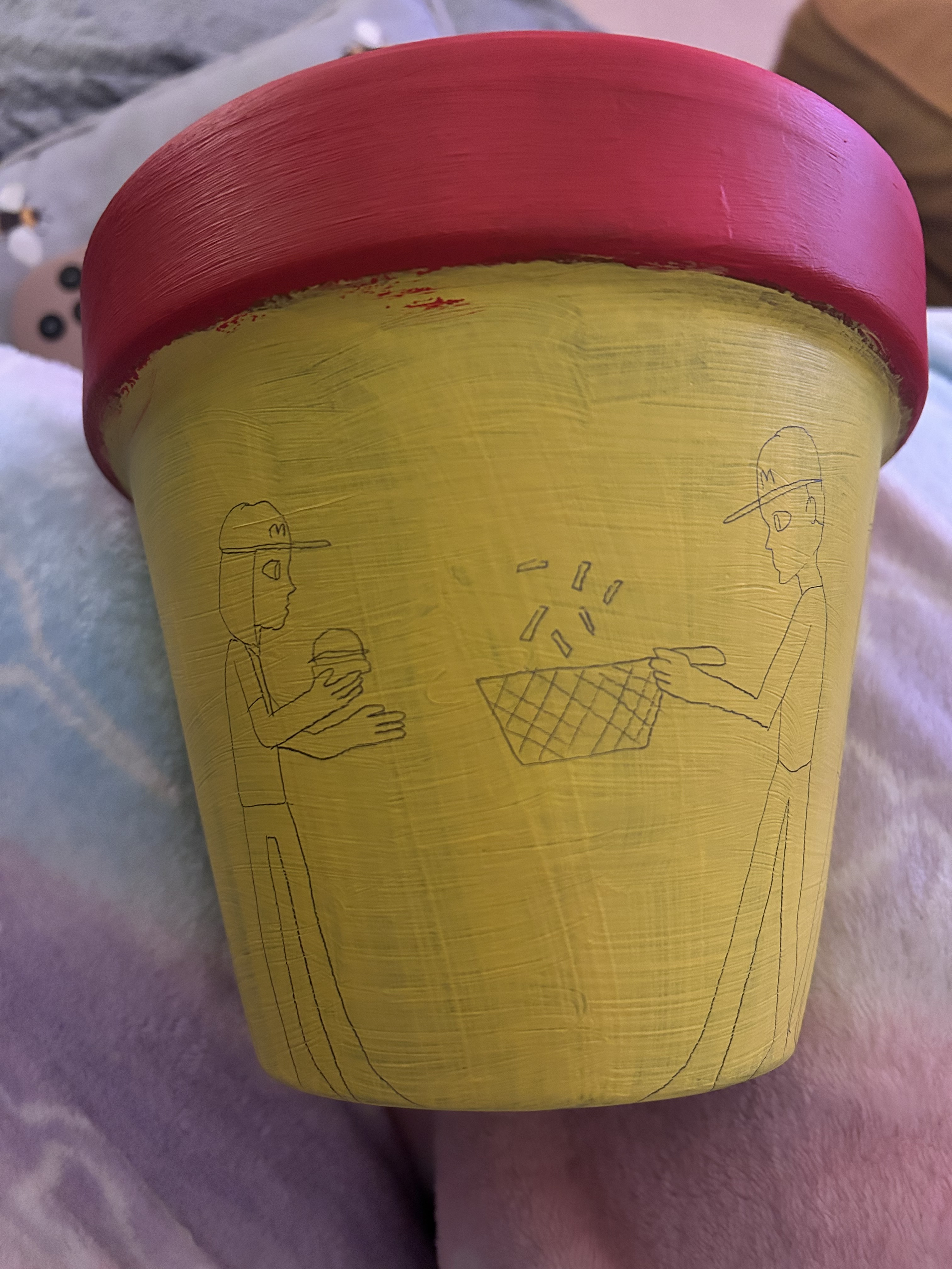 Red and Yellow painted terracotta pot with pencil sketches of design:
