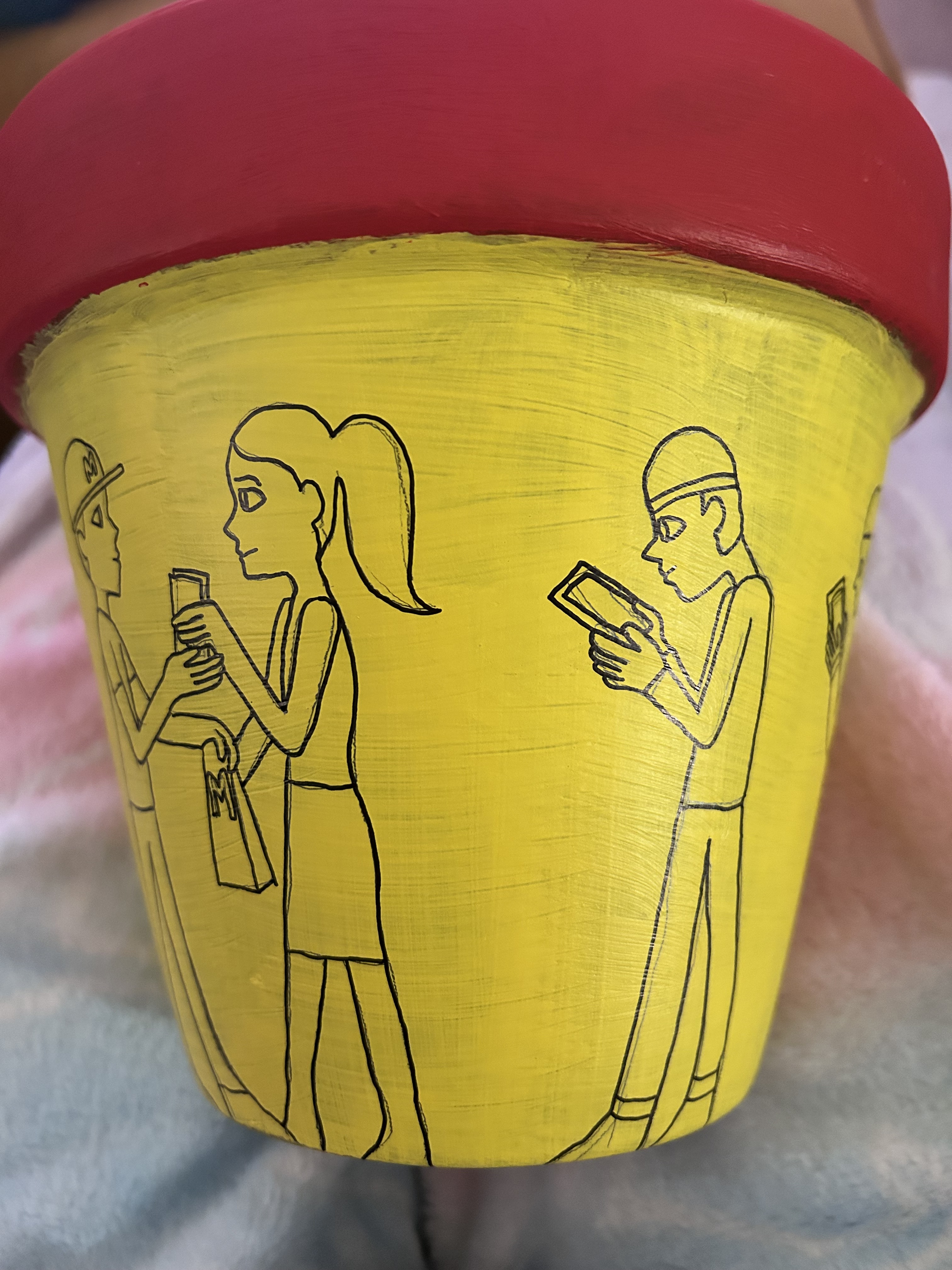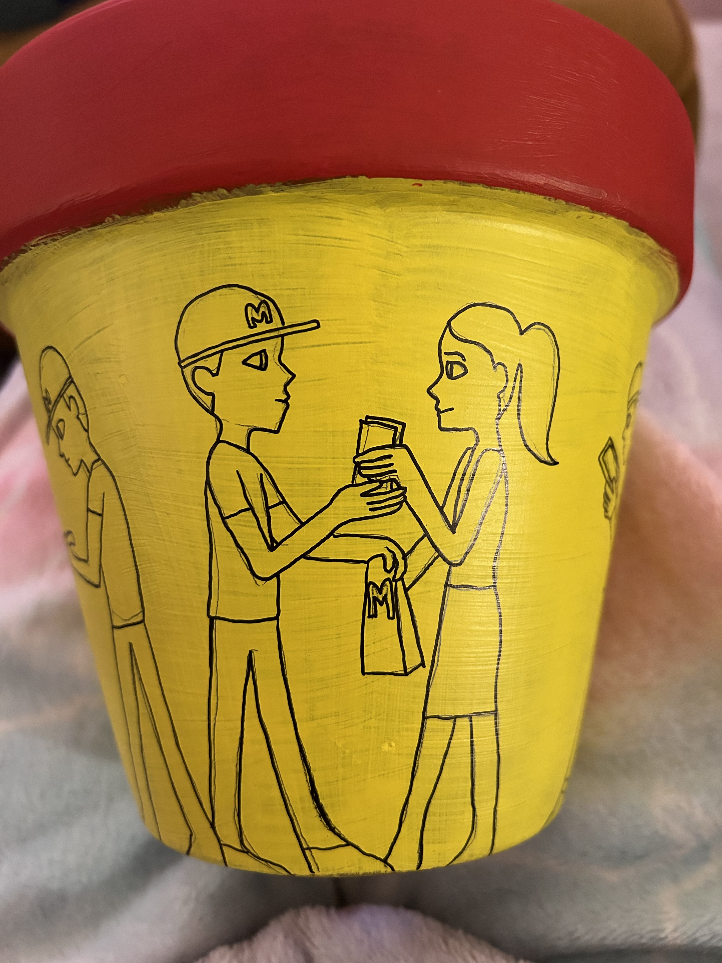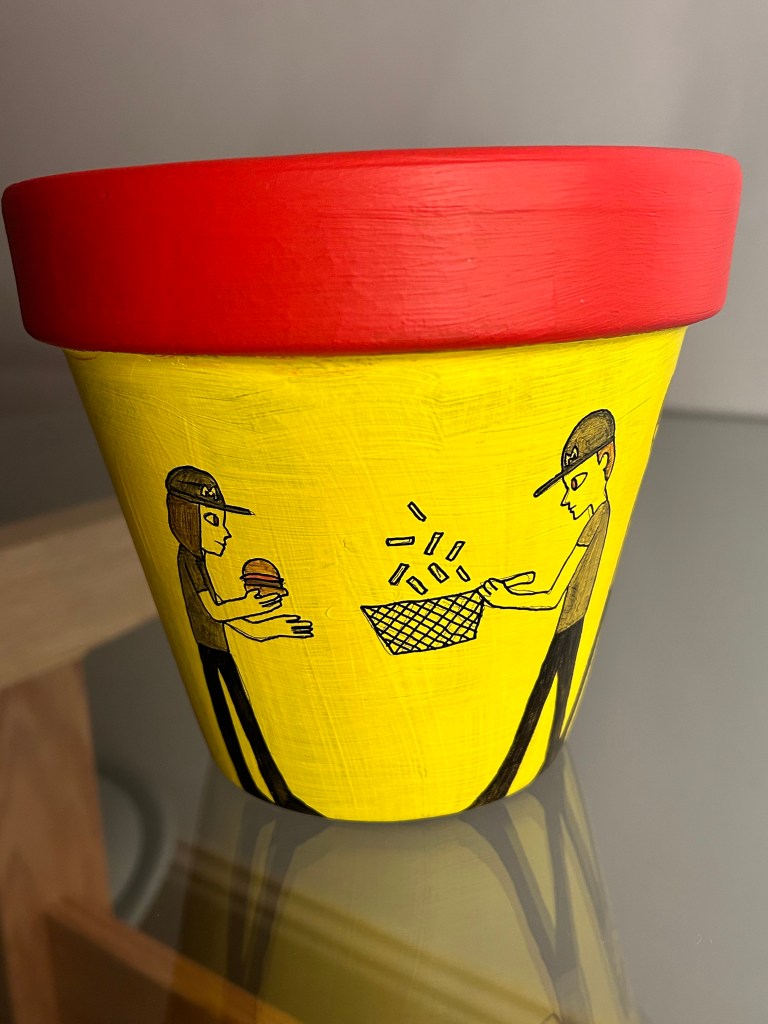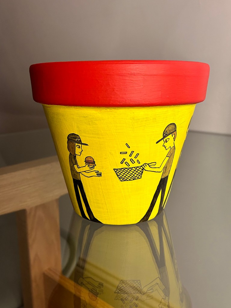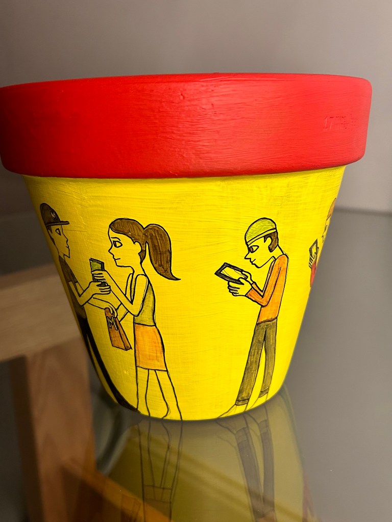 I’m going to bring the design up to date by incorporating a modern setting into it. I will show people in a queue at McDonalds. The people in the queue will all be on their phones which is the usual sight apart from the person at the front of the queue who is receiving her order. There will be a cashier, and two employees in the back making fries and burgers. I will make the terracotta design red and yellow to show the McDonald’s colours. I got this idea from the way the Greek show people in a line around the pot or bowl for instance in the image above. I thought that changing design to people in a queue for McDonald’s would modernise it.