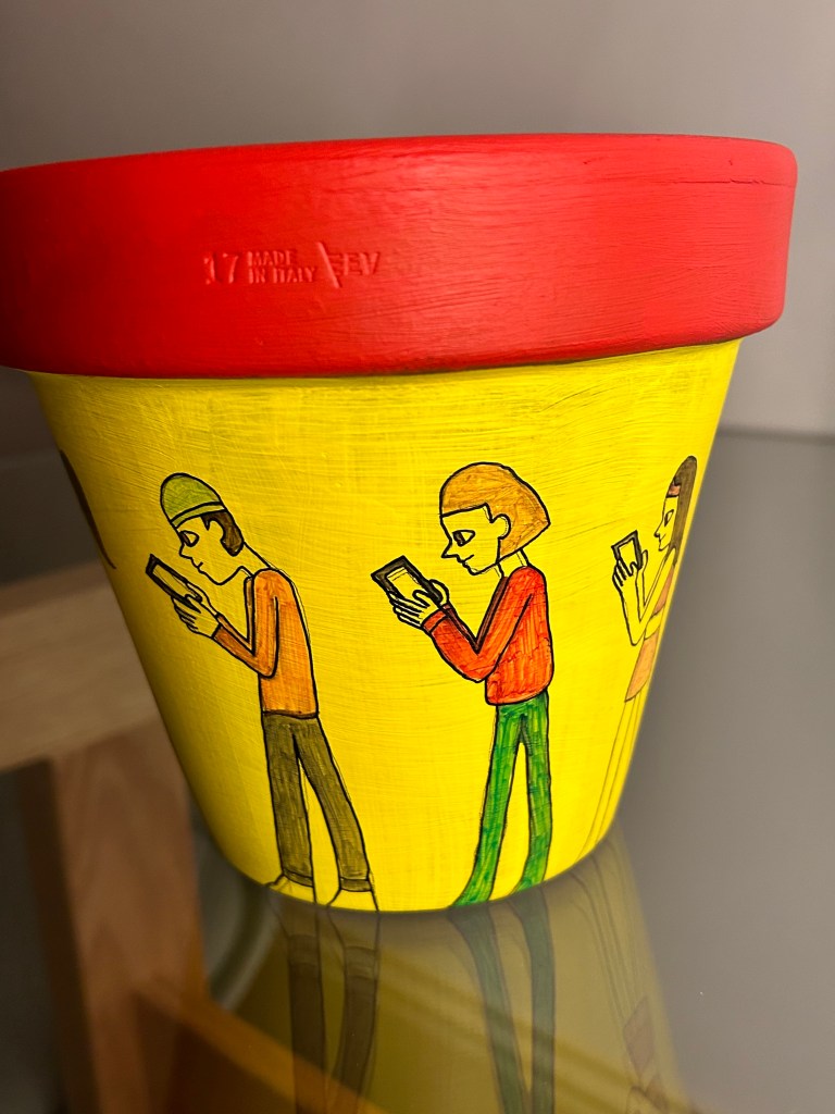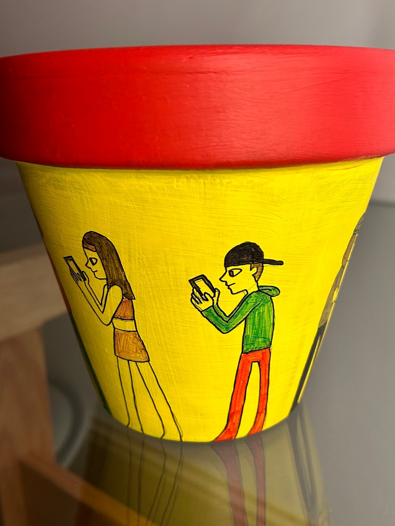I didn’t enjoy this exercise, I think it was because I worked in 3D on an actual pot when I am not a 3D artist. As interesting as it was to create a 3D design I feel as though this opportunity has made me realise just how much I enjoy working digitally or at least in 2D traditionally paper-based. I still think my idea is good and interesting but maybe it would work better digitally as a mock-up rather than like this!