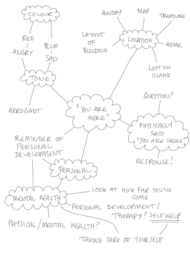 For this assignment I will creatively explore the statement ‘you are here’. I will produce a short self-published fanzine. This assignment brief was really open so I firstly needed to think about what I was going to do. I started off with idea generation as I didn’t know where to start, I needed to pick a direction.