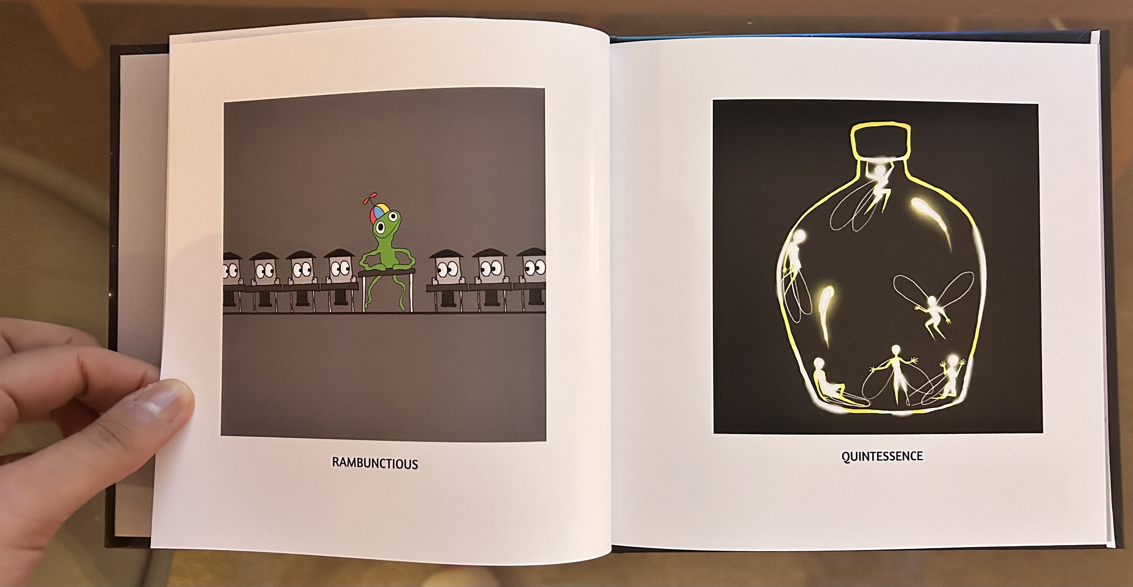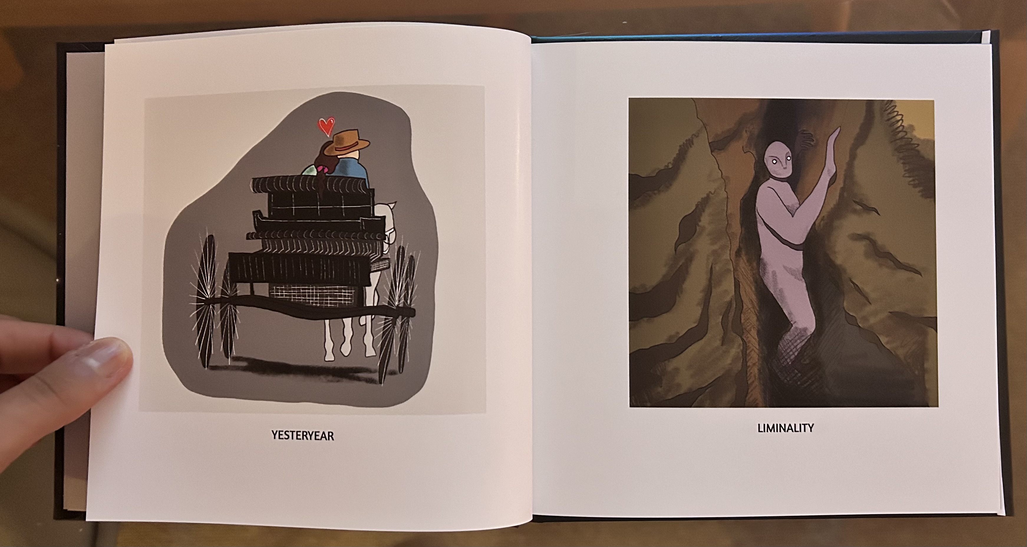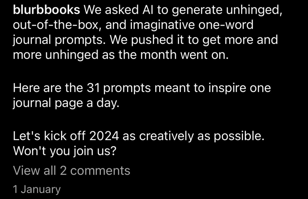 I was on Instagram looking for prompt art challenges and stumbled across Blurb’s ‘One page a day’ AI generated “unhinged, out of the box and imaginative one word prompts” for January 2024. The company Blurb also prints self-published books so it was helpful to find a company that does both things that I need for this project brief!
