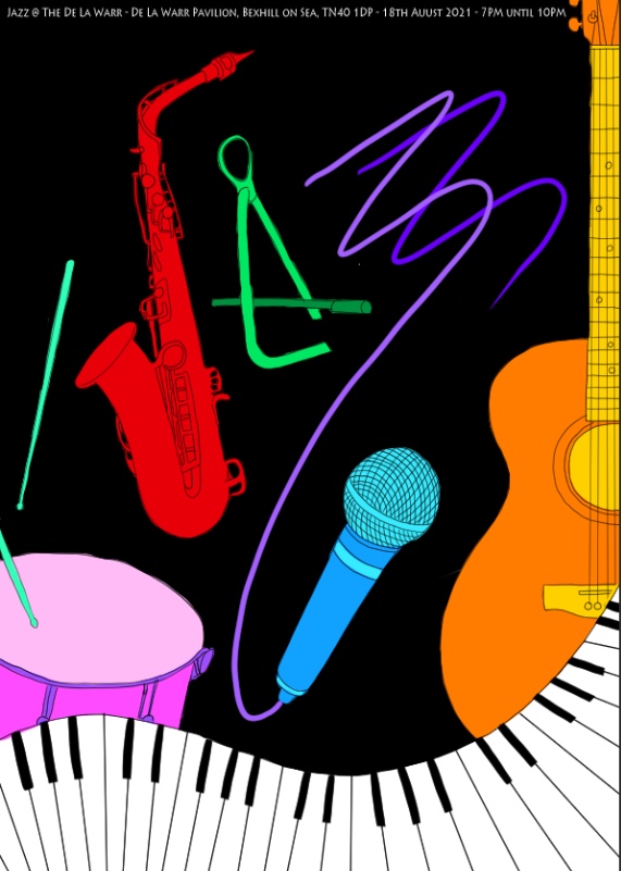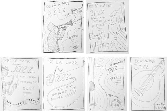 Above are 6 thumbnail sketches showing different potential compositions and designs. I think the designs are very different to one another but all have the potential to be developed into interesting designs. As you can see from the designs I decided to host my jazz evening at the ‘De La Warr’ in Bexhill as I found this venue to have interesting architecture and a wonderful spiral staircase in the middle of the building, this style of architecture made me feel like the building would have very good acoustics if a jazz night were to take place there. My thumbnail sketches focus mostly on the jazz instruments and have a very smooth/flowing vibe to the whole design.