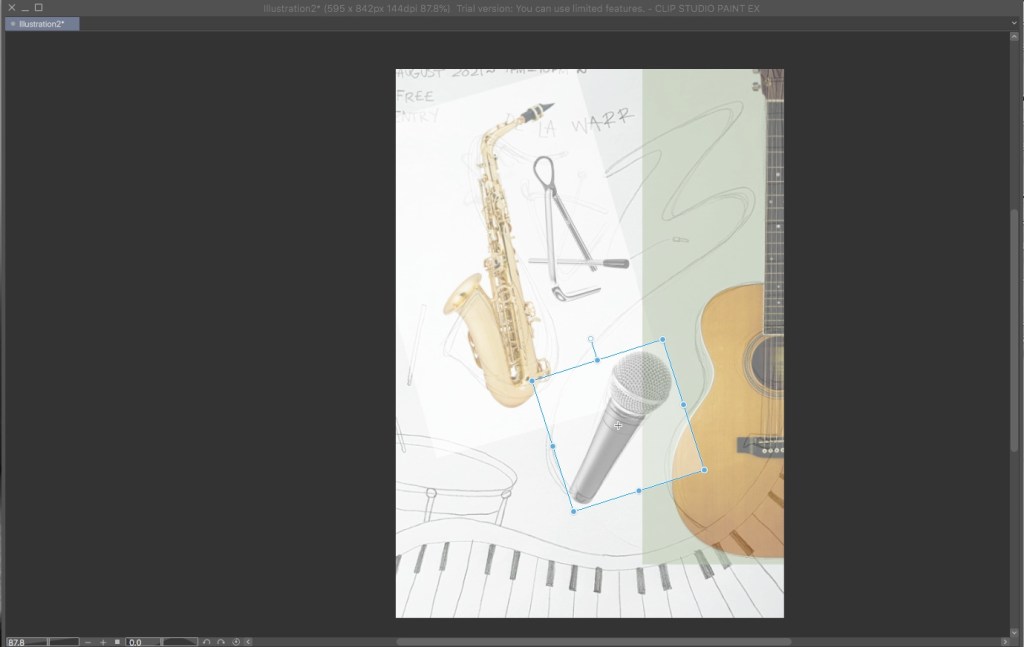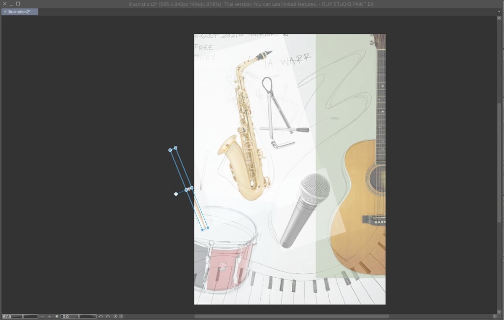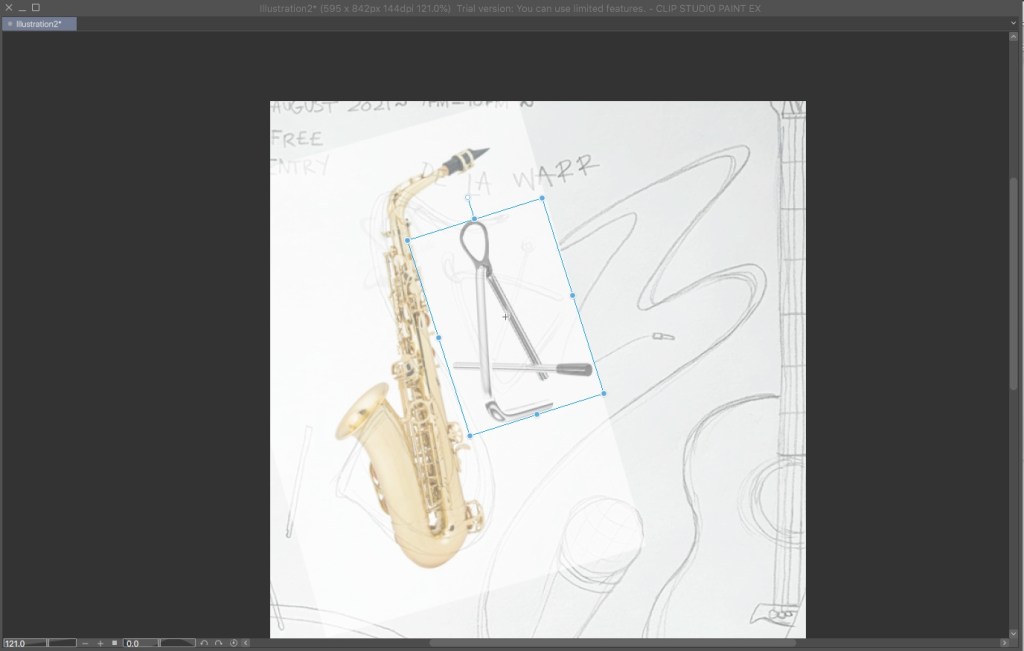 I then started importing photos of real instruments so that the illustration would have more of a professional feel to it, unlike the instruments on my visual design that didn’t look in proportion (my illustration of the saxophone was completely from memory so it looked really weird so I knew that I had to look at ‘real’ instruments when I created my final design). Here you can see that I have just started importing the images of instruments into the design, starting with the saxophone. My idea in the visual was to make the word ‘jazz’ out of the instruments in the illustration, so I start of with the saxophone ‘J’…