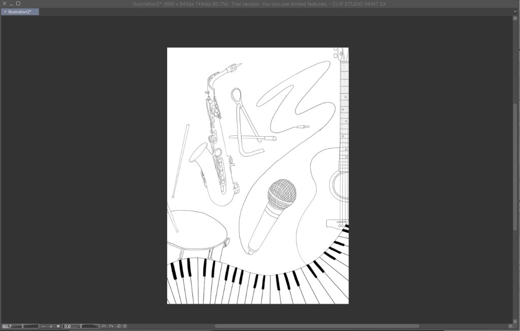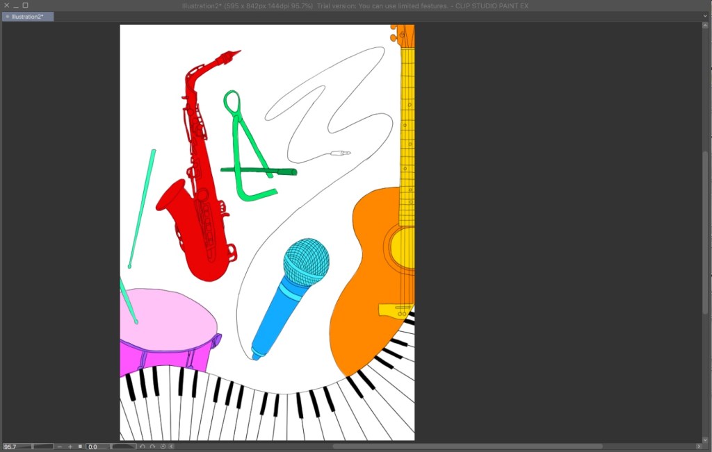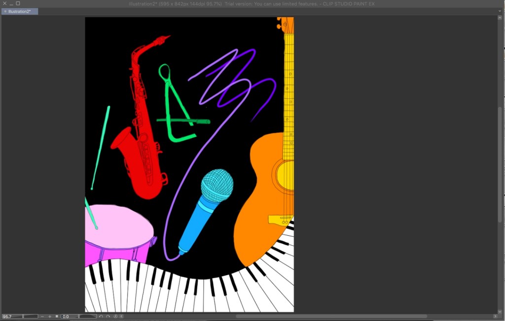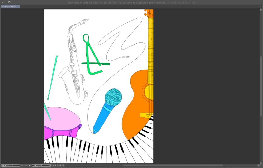 I then started incorporating colour into the image using the ‘layers’ feature on my digital drawing program. By using layers I made sure that I could add colour underneath the outlines so that the lines would still be clear. I wanted to have the biggest and boldest colours in my design on the instruments and took inspiration from the colours that I had found when creating my moodboard earlier on in the assignment.