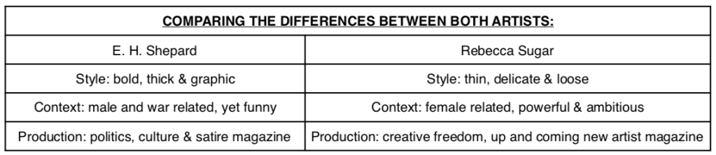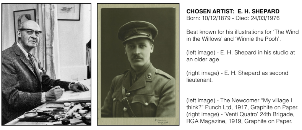 E. H. Shepard lived at Melina Place in St Johns Wood, London. In 1914 when Shepard was in his mid-thirties, he was commissioned as a second lieutenant in the Royal Garrison Artillery. Throughout the war, Shepard had been contributing to Punch Magazine. He was hired as a cartoonist for the magazine in 1921 and became a lead cartoonist in 1945. Shepard was recommended to A. A. Mine in 1923 by another Punch staff member called E. V. Lucas. A. A. Milne insisted that Shepard illustrate ‘Winnie the Pooh’.