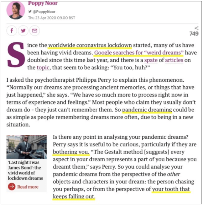 My chosen news article: https://www.theguardian.com/lifeandstyle/2020/apr/23/coronavirus-dreams-what-could-they-mean