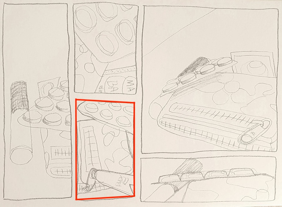 After taking photos of my chosen objects, I drew them from real life. I didn’t use a viewfinder because I was fine without. I drew the objects in different formats. My favourite design I have highlighted. I like the way the zip handle looks massive in comparison to the rest of the image. Also, referring back to ‘the morning after’ I chose this design as it looks like the type of view someone would have of objects on a side table once they have woken up after a night out. The purse being closest to the person’s eye as they wake.