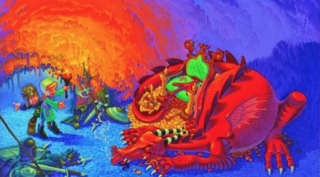 The image shows two people in the depths of a cave opposite a sleeping dragon who is guarding his treasures. The boy seems to be pointing to the exit of the cave as a way of signalling that they should turn back as what they’re doing is dangerous. The girl seems to be ignoring the boy and offering her hand to the dragon as a way of saying that she means no harm to the dragon, she is also holding a torch (fire) which is illuminating the insides of the cave, turning the cooler colours (blue & purple) to hot colours (red, orange & yellow). The illumination also brings out the hot colours on the dragon, revealing it (red) and its treasure (yellow) which is as bright and sparkly as the illumination of the fire itself. The insides of the cave are well textured showing exactly where they are as the roof of the cave shows stalactites and depth is described with cool colours. The same goes for the ground of the cave which is has a cobbled effect that shows many tiny stones. I think the connection between hot colours in this image is to show power and danger. The girl is holding a torch which could hurt the dragon and the dragon itself is powerful and dangerous as illustrated by it’s large red body and spiky back, claws and horns.